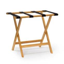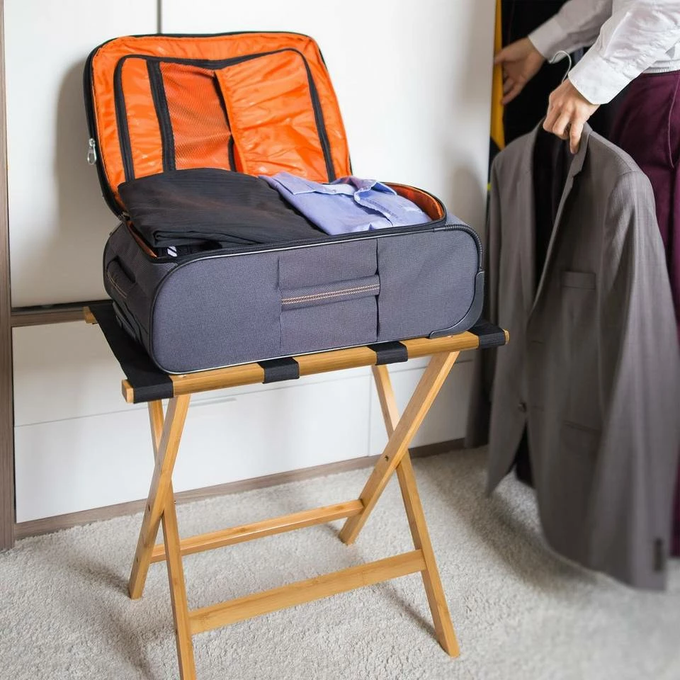 Praktischer Kofferhocker für Reisen Befüllen Sie Ihr Gepäck in bequemer Höhe auf dieser schönen Kofferablage. 4 straff gespannte Bänder aus Nylon sorgen dabei für einen sicheren Halt Ihrer Taschen. Der hochwertig verarbeitete Bambus verfügt über eine fein verzweigte Maserung, die sich rustikal in Ihre Einrichtung fügt. Damit eignet sich der Kofferständer sowohl für beruflich Vielreisende als auch für Hotels oder Pensionen. Dank des Klappmechanismus kann er zudem bei Nichtbenutzung platzsparend verstaut werden.
