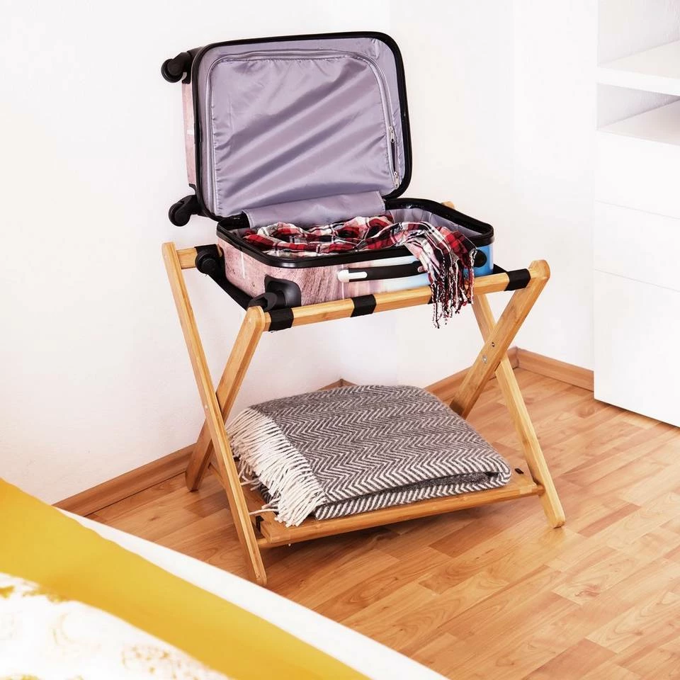 Kofferständer mit Ablage Mit dem Kofferständer wird das Packen bequemer. Reisetaschen und Koffer befüllen Sie damit in angenehmer Höhe. Damit schonen Sie nicht nur ihren Rücken, weil das lästige Bücken entfällt. Ihre Taschen haben auch mehr Halt als auf einem Stuhl oder dem Bett. Die Gepäckablage eignet sich besonders für Vielurlauber oder Geschäftsreisende. Auch Ferienhäuser oder Hotels bieten Ihren Gästen somit mehr Komfort. Auf der extra Ablage über dem Boden findet sich zusätzlicher Stauraum für Schuhe oder ähnliches. Bei Nichtgebrauch können Sie den Kofferständer zudem platzsparend vertauen.