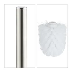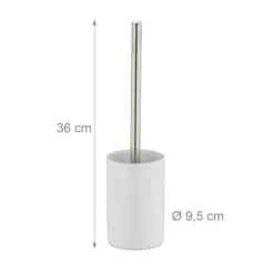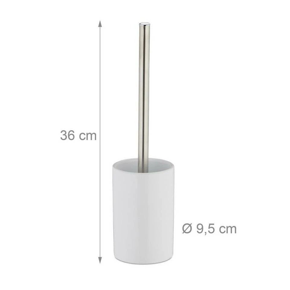 10x WC-Bürstengarnitur für Ihr Bad Die WC-Garnitur umfasst einen Bürstenhalter und die passende Toilettenbürste. Das WC-Set lässt sich im Bad oder Gäste-WC sehr flexibel ohne Bohren positionieren. Der Keramikbehälter ist mit einem nassen Lappen im Handumdrehen gereinigt und punktet mit seiner schnörkellosen Optik. Auch der Bürstengriff fügt sich mit seiner matten Metalloberfläche sehenswert ein. Sollte sich der Bürstenkopf einmal abgenutzt haben, tauschen Sie ihn einfach gegen einen neuen aus. Der passende Ersatzbürstenkopf ist das Relaxdays-Modell 10021026 (ca. 12 mm großes Innengewinde, Gesamtgröße ca. 8 cm).