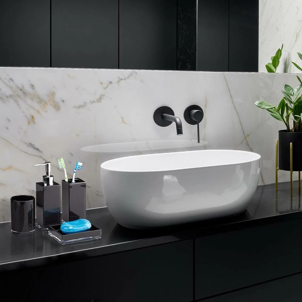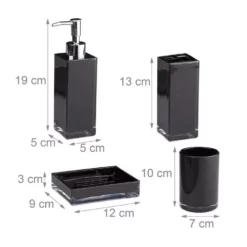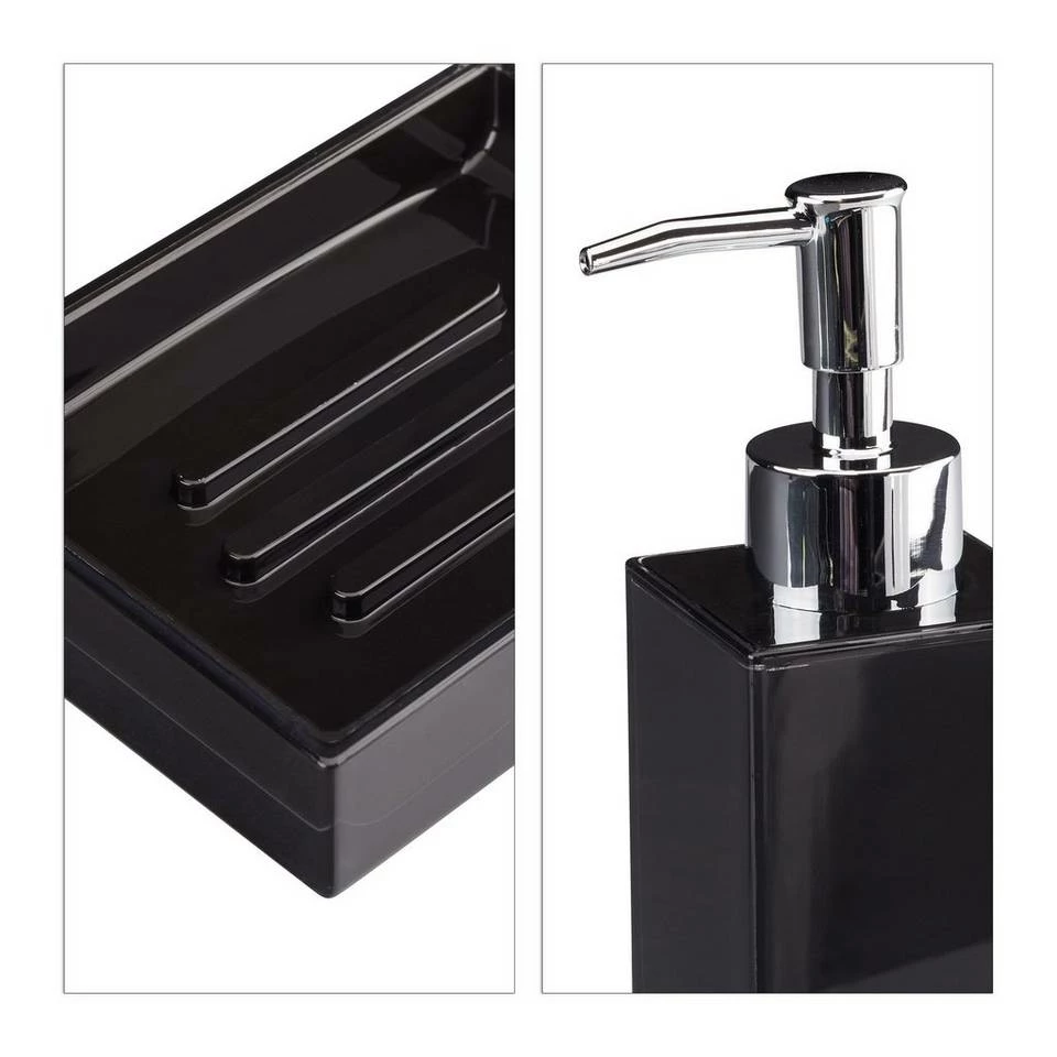 - 4-teiliges Set: Moderne Badaccessoires im praktischen Set – Optisch aufeinander abgestimmtes Badzubehör aus Kunststoff – In Hochglanz Schwarz