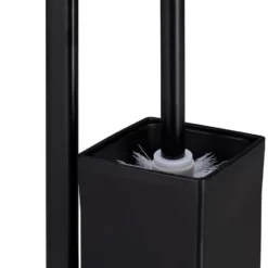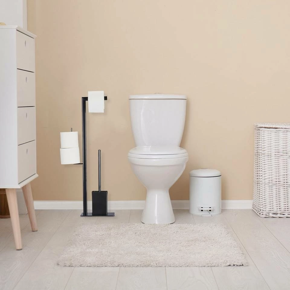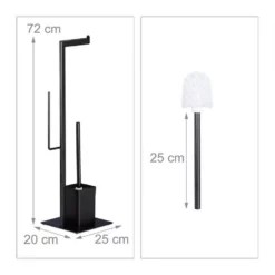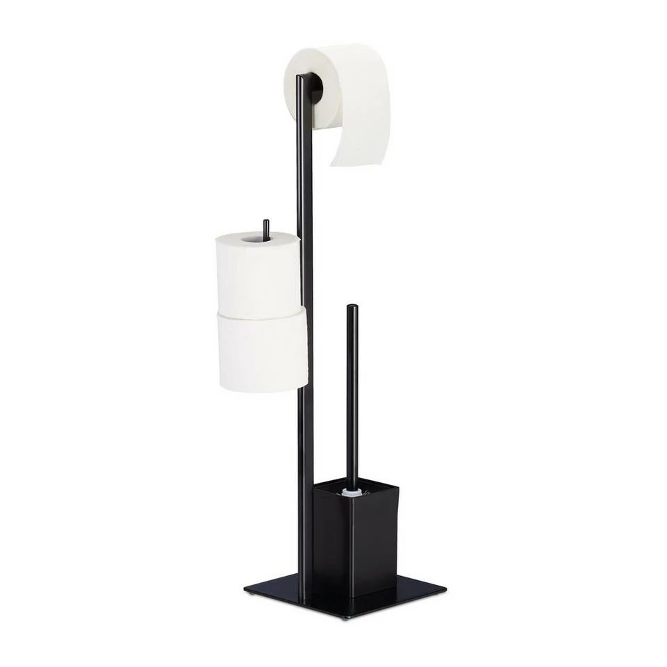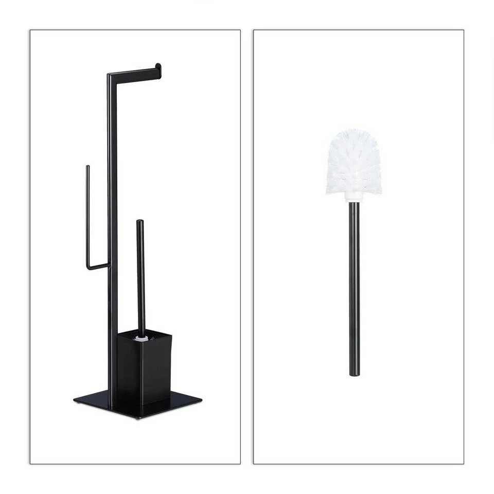 Toilettenbutler in schickem Matt-Schwarz Im Badezimmer oder Gäste-WC – mit dieser WC Garnitur haben Sie stets Klopapier, Klobürste und bis zu 2 Ersatzrollen griffbereit. Der Toilettenbutler in schickem Matt-Schwarz lässt sich freistehend beliebig platzieren und verhindert dank Kunststoffschoner Kratzer im Boden. Das moderne Design wird dabei ein toller Hingucker in Ihrem Bad. Für die entsprechende Hygiene sorgen der entnehmbare Bürstenbehälter und der austauschbare Bürstenkopf. Achtung: Bitte achten Sie beim Kauf eines Ersatzbürstenkopfes auf einen Kopf-Durchmesser von etwa 8 cm und ein Innengewinde von ca. 9,5 mm, wie beim Relaxdays Bürstenkopf-Modell 10021025.