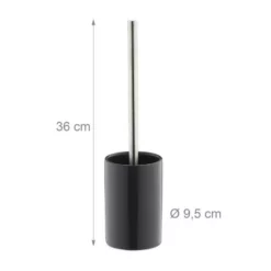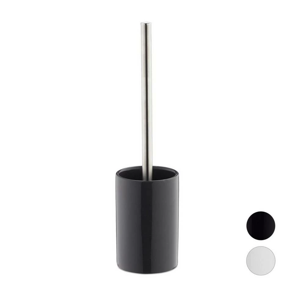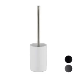 WC-Bürstengarnitur für Ihr Bad Die WC-Garnitur umfasst einen Bürstenhalter und die passende Toilettenbürste. Das WC-Set lässt sich im Bad oder Gäste-WC sehr flexibel ohne Bohren positionieren. Der Keramikbehälter ist mit einem nassen Lappen im Handumdrehen gereinigt und punktet mit seiner schnörkellosen Optik. Auch der Bürstengriff fügt sich mit seiner matten Metalloberfläche sehenswert ein. Sollte sich der Bürstenkopf einmal abgenutzt haben, tauschen Sie ihn einfach gegen einen neuen aus. Der passende Ersatzbürstenkopf ist das Relaxdays-Modell 10021026 (ca. 12 mm großes Innengewinde, Gesamtgröße ca. 8 cm).