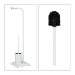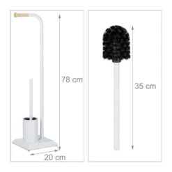 Weiße WC-Garnitur in modernem Design Die edle WC-Garnitur ist das ideale 2 in 1 Modell für das Badezimmer. Die Kombination besitzt einen Behälter für die Klobürste sowie einen Platz für das Toilettenpapier. Der freistehende Klopapierhalter passt dank des viereckigen Standfußes in jede beliebige Ecke. Zudem ist er rutschfest und steht stabil. Das Aussehen überzeugt mit einem modernen Design in leicht glänzendem Weiß. Problemlos tauschen Sie den Bürstenkopf bei dem Halter aus, womit auch die Hygiene sichergestellt ist.