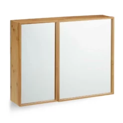 Bad Spiegelschrank für mehr Stauraum Mit dem breiten Spiegelschrank für das Bad haben Sie den vollen Überblick. Der große Spiegel unterstützt Sie beim morgendlichen Herausputzen. Hinter den voll verspiegelten Schranktüren geben zwei individuell einsetzbare Einlegeböden Raum für Zahnputzbecher, Cremes und Hygieneartikel. Der robuste Wandschrank ist aus langlebigem Bambus gefertigt. Das widerstandsfähige Material absorbiert Feuchtigkeit und ist somit für das Badezimmer und andere Feuchträume bestens geeignet. Der naturfarbende Hängeschrank beweist mit seinen asymmetrischen Türen ohne Griff Stil und fügt sich in jede Einrichtung ein.