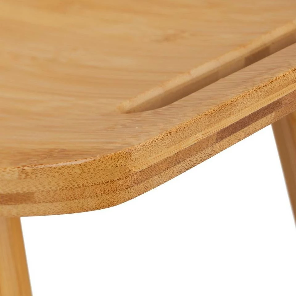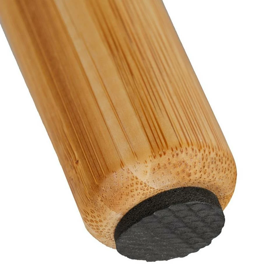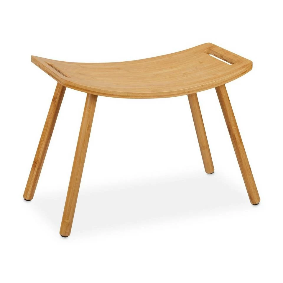 Beistellhocker in geschwungener Form Der ergonomische Hocker ist eine gemütliche Sitzgelegenheit für Ihr Badezimmer. Aber auch im Flur ist der Sitzhocker praktisch, um sich bequem die Schuhe anzuziehen. Die geschwungene Sitzfläche bietet dabei ein angenehmes Sitzgefühl. An den seitlichen Griffen ist der stabile Hocker auch schnell mal angehoben und anders platziert. Das natürliche Design aus Bambus ist ideal in Feuchträumen und ein echter Blickfang in jeder Wohnung.