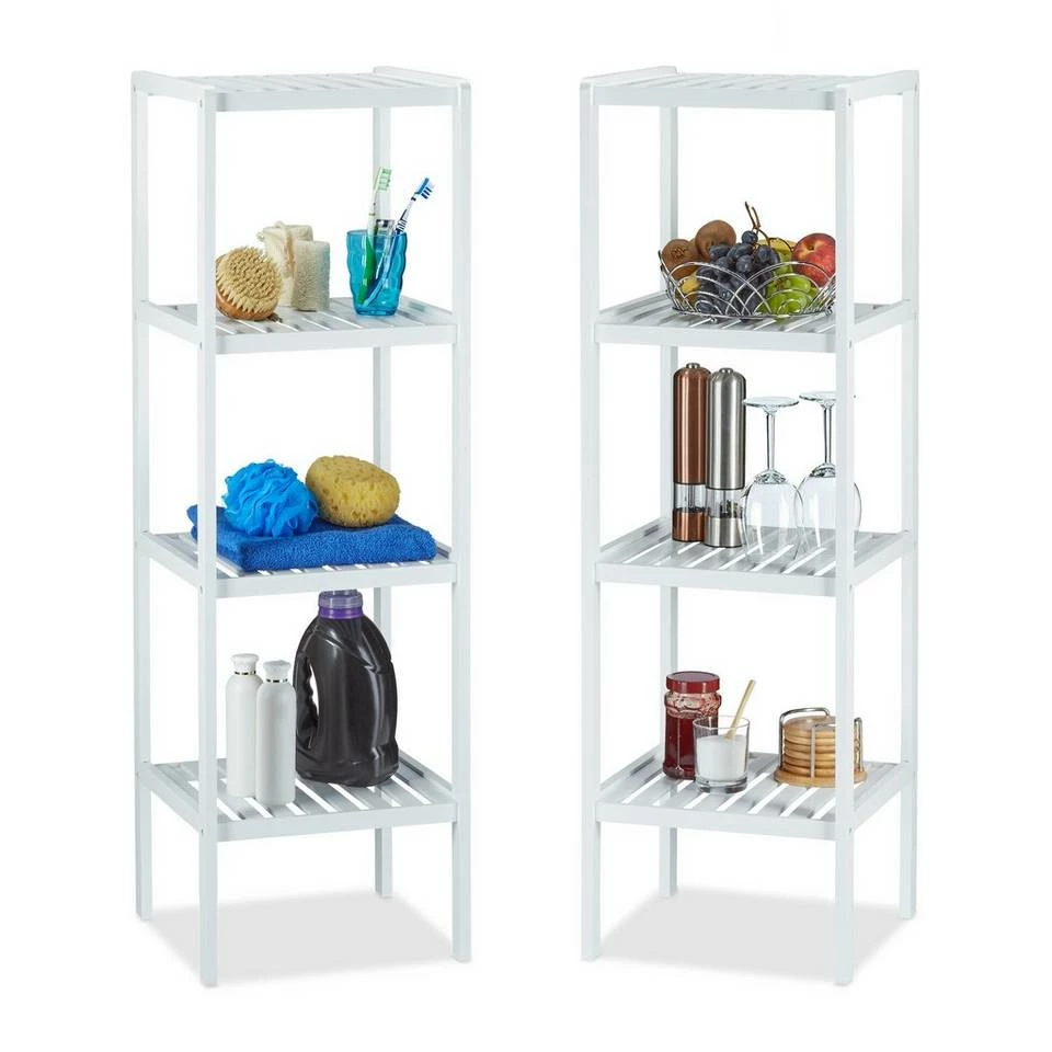 Bambus Badregal in Weiß Ob Küche oder Bad, Kinderzimmer oder Keller: Freier Stauraum ist rar. Wenn auch Sie den Eindruck haben, dass Ihnen Küchenutensilien, Handtücher, Bücher und Schuhe allmählich über den Kopf wachsen, schafft dieses Standregal aus Bambus Abhilfe. Das Bambusregal benötigt nur eine geringe Stellfläche und wartet mit 4 quadratischen Ablagen im trendigen Gitter-Look auf. Das freistehende Regal ist sehr leicht und lässt sich im Handumdrehen aufbauen. Ein tiefer Griff in die Werkzeugkiste ist nicht erforderlich, denn alle nötigen Montagematerialien sind im Lieferumfang bereits enthalten.