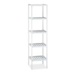 Bambus Badregal weiß Im Keller wird der Platz langsam knapp und auch im Wohnzimmer wissen Sie gar nicht mehr, wo Sie mit all den Büchern, Zeitschriften, Schuhen und den anderen Gegenständen hinsollen? Dieses Standregal sorgt dank seiner geringen Stellfläche im Handumdrehen für neuen Stauraum. Die 5 quadratischen Ablageflächen des Badregals stechen durch ihre luftige Gitter-Optik ins Auge. Das Küchenregal ist aus Bambus gefertigt und kommt in der weißen Farbvariante zu Ihnen. Nicht nur optisch überzeugt das Bambusregal, denn es ist darüber hinaus auch leicht zu montieren. Alles, was Sie dafür benötigen, ist im Lieferumfang bereits enthalten.