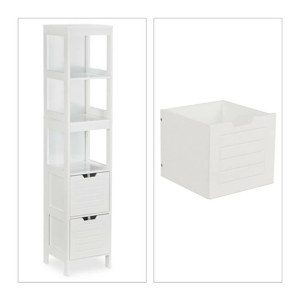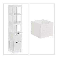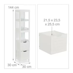 Praktisches Ablageregal fürs Bad Sorgen Sie in Ihrem Badezimmer für zusätzlichen Stauraum mit diesem schicken Hochschrank. Auf 3 offenen Ablagen und in 2 Schubfächern ist viel Platz für verschiedene Badutensilien. Dabei ist das weiße Badezimmerregal im Landhaus-Design passend für Fans des unkomplizierten und rustikalen Stils. Durch 4 Bodenschoner ist das Baderegal zum einen rutschfest und zum anderen ist der Untergrund vor Kratzern sicher. Der Aufbau des Midischranks ist mit der beiliegenden Anleitung schnelle erledigt.