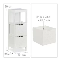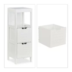 Platzsparender Midischrank in mattem Weiß Dieser schmale Schrank schafft in jedem Badezimmer zusätzlichen Stauraum. In den 2 Schubladen, die mit einen praktischen Auszugsstopp versehen sind, können Sie Badutensilien wie Shampoo, Haarbürste, Haartrockner und Kosmetika ordentlich verstauen. Dabei bietet der Hochschrank durch seine ansprechende Optik im Landhausstil einen tollen Anblick. Das weiße Badezimmer Regel besteht komplett aus pflegeleichten MDF. Der Aufbau des Midischranks ist dank einer ausführlichen Anleitung im Nu erledigt.