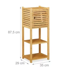 Niedriges Regal aus natürlichem Bambus Holen Sie sich für Ihr Badezimmer zusätzlichen Stauraum. Das schicke Ablageregal punktet mit 4 Ebenen, worauf Handtücher, Kosmetik, Haartrockner und andere Badutensilien übersichtlich untergebracht werden können. Ein Fach des Bambusregals besitzt eine Tür mit Magnetverschluss, hinter der Sie unter anderem Hygieneartikel diskret verstauen können. Das natürliche Design aus robustem Bambus ist feuchtigkeitsresistent und daher für das Bad, die Küche oder den Waschraum besonders gut geeignet.