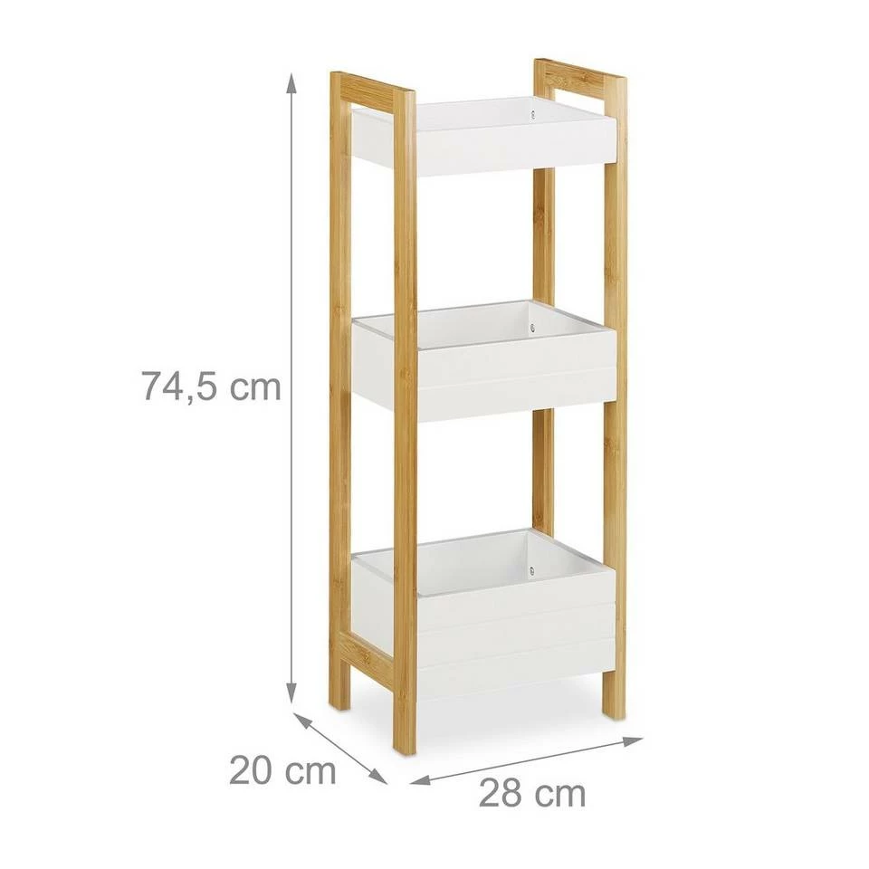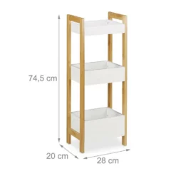 Modernes Beistellregal für Bad, Küche und mehr Schaffen Sie zusätzlichen Stauraum im Badezimmer mit diesem modernen Standregal. In 3 unterschiedlich großen Körben können Kosmetika, Handtücher, Toilettenpapier und mehr übersichtlich und griffbereit verstaut werden. Das schmale Regal ist dabei ideal für kleine Bäder geeignet. Doch auch in der Küche oder im Wohnzimmer macht das freistehende Korbregal eine gute Figur. Die aufregende Kombination des naturfarbenen Bambusgestells mit den weißen Fächern sorgt in jedem Fall für einen Hingucker.