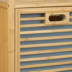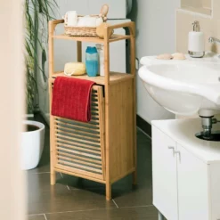 Baderegal mit Wäschekorb und 2 Ablagen Mit der Kombination aus Badregal und Wäschekorb bringen Sie Ordnung in Ihr Badezimmer. Der praktische Wäschesack ist zum Ein- und Ausklappen und lässt dreckige Wäschen elegant aus dem Blickfeld verschwinden. Das Badregal eignet sich zudem hervorragend um kleine Utensilien wie Kosmetik, Waschmittel uvm. platzsparend unterzubringen. Der natürliche Bambus fügt sich durch das ansprechende Design elegant in Ihr Badezimmer ein.