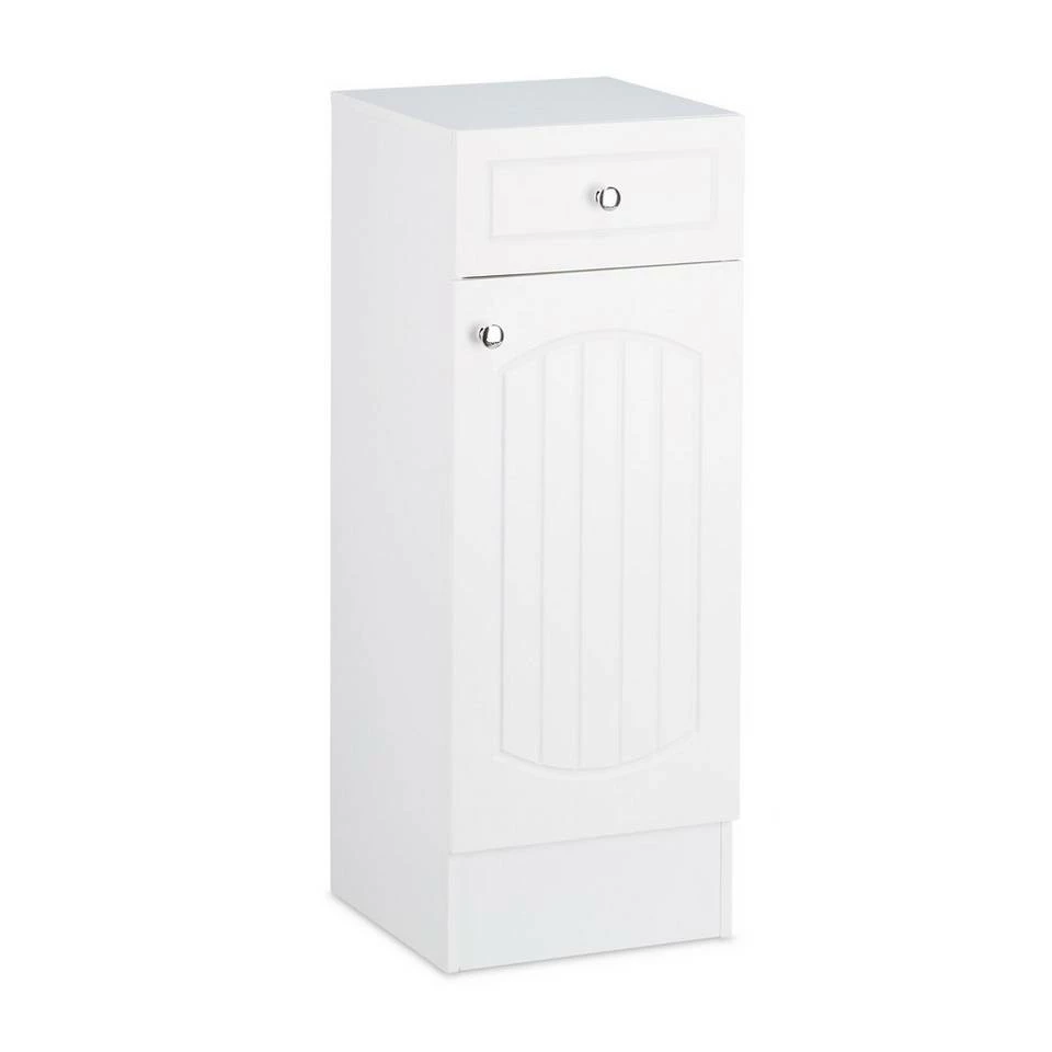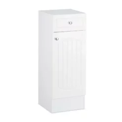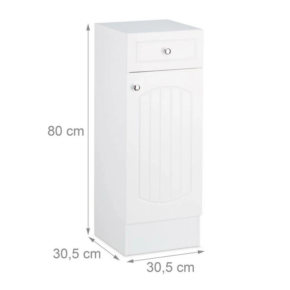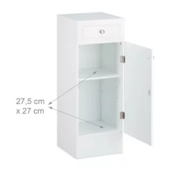 Badschrank aus Holz für Ihr Badezimmer Dieser Badschrank aus Holz ist ideal, falls Sie neuen Stauraum in Ihrem Bad, Kinderzimmer oder Flur benötigen. Zur Aufbewahrung kleinerer Badutensilien stehen Ihnen eine Schublade sowie zwei Böden zur Verfügung, ein fester und ein einlegbarer. Der Einlegeboden wird von 4 Halterungen aus Kunststoff getragen, die Sie bei Bedarf einfach abnehmen können, um größere Gegenstände unterzubringen. Der kleine Badezimmerschrank sorgt nicht nur für Ordnung im Badezimmer, sondern fügt sich in Weiß und seinem angenehmen Lamellen-Muster wunderbar gerade in dunklere Badeinrichtungen bestens ein.