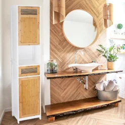 Geräumiger Badezimmerschrank in Weiß Viel Stauraum bei geringer Stellfläche bietet Ihnen der dekorative Hochschrank mit Türen und Schubfach aus Bambus. Der Hochschrank in Lamellen-Optik kann mit fünf Ablagen ausreichend Handtücher und Badaccessoires aufbewahren. Für ein besonders reibungsloses Schließen der Schranktüren sorgt ein magnetischer Türhalter. Neben passender Funktionalität weiß der Midischrank vor allem auch durch sein ansprechendes Design zu überzeugen. Holen Sie sich jetzt den in hellen Farben gehaltenen Badschrank und lassen Sie Ihr Badezimmer strahlen.