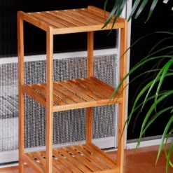 Badregal aus Bambus Mit diesem Regal aus Bambus schaffen Sie Ordnung im Badezimmer. 3 Ebenen bieten Raum für Handtücher, Cremes oder Kosmetika. Durch eine geringe Höhe eignet sich das Regal sehr gut neben der Badewanne. Aber auch in anderen Zimmern leistet das Bambusregal gute Dienste. In Küche, Flur, Keller oder Gästezimmer können Sie kleine Gegenstände, Bücher, Schuhe etc. aufbewahren. Der natürliche Holzton wirkt schlicht, und lässt sich dezent in jeden Raum integrieren lässt.