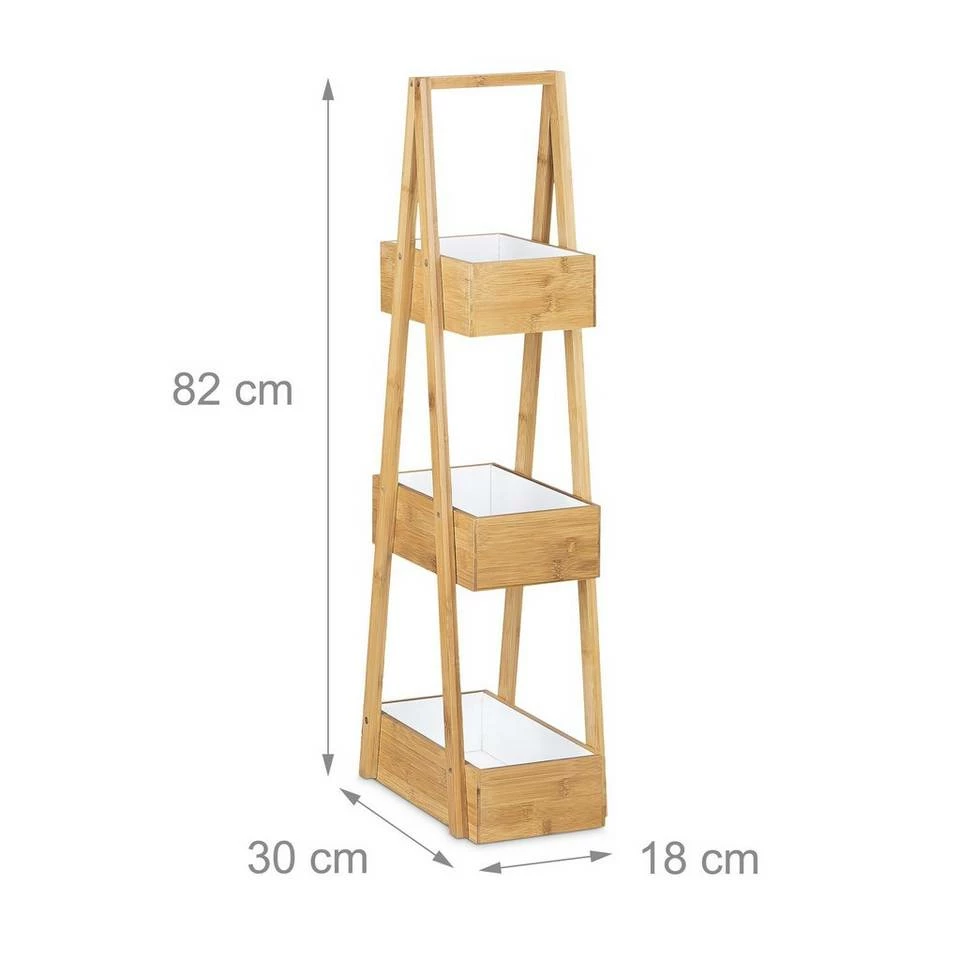 Bambus Badregal mit 3 Körben Für mehr Ordnung im Badezimmer ist das Bambus Badregal mit drei Ebenen ideal. Das freistehende Allzweckregal ist aus feuchtigkeitsliebendem Bambus und somit ideal für Feuchträume wie Bad, Keller oder Küche. Aber auch im Büro hilft der hölzerne Organizer, den Überblick zu behalten. Das schmale, offene Regal ist leicht und robust. Die zusammenlaufenden Bambus-Streben münden in einem Henkel, der Ihnen erlaubt, das Standregal bequem zu verstellen. Nutzen Sie das platzsparende Ordnungssystem auch als dekorative Aufbewahrungsmöglichkeit im Wohnzimmer oder als Werkzeug-Ablage in der Werkstatt.