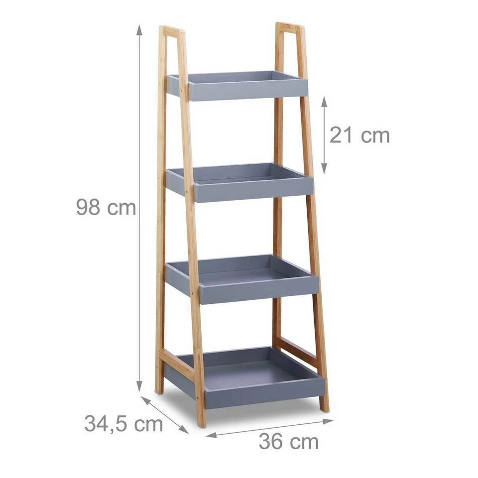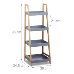 Schönes Badregal aus Bambus Dieses komplett aus Bambus gefertigte Standregal ist ein optisches Highlight und fügt sich perfekt in jeden Einrichtungsstil ein. Mit seinen 4 unterschiedlich großen farblich abgesetzten Ablagen bietet das Bambusregal nicht nur Platz für sämtliche Bad- und Kosmetikutensilien, sondern eignet sich auch perfekt zum Verstauen und Präsentieren von Büchern, Pflanzen, Schuhen etc. So ist das Regal auch im Kinderzimmer, Arbeitszimmer, Wohnzimmer oder Flur ein schönes und nützliches Wohnaccessoire. Das Regal ist zudem schnell und mit wenigen Handgriffen aufgebaut.