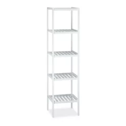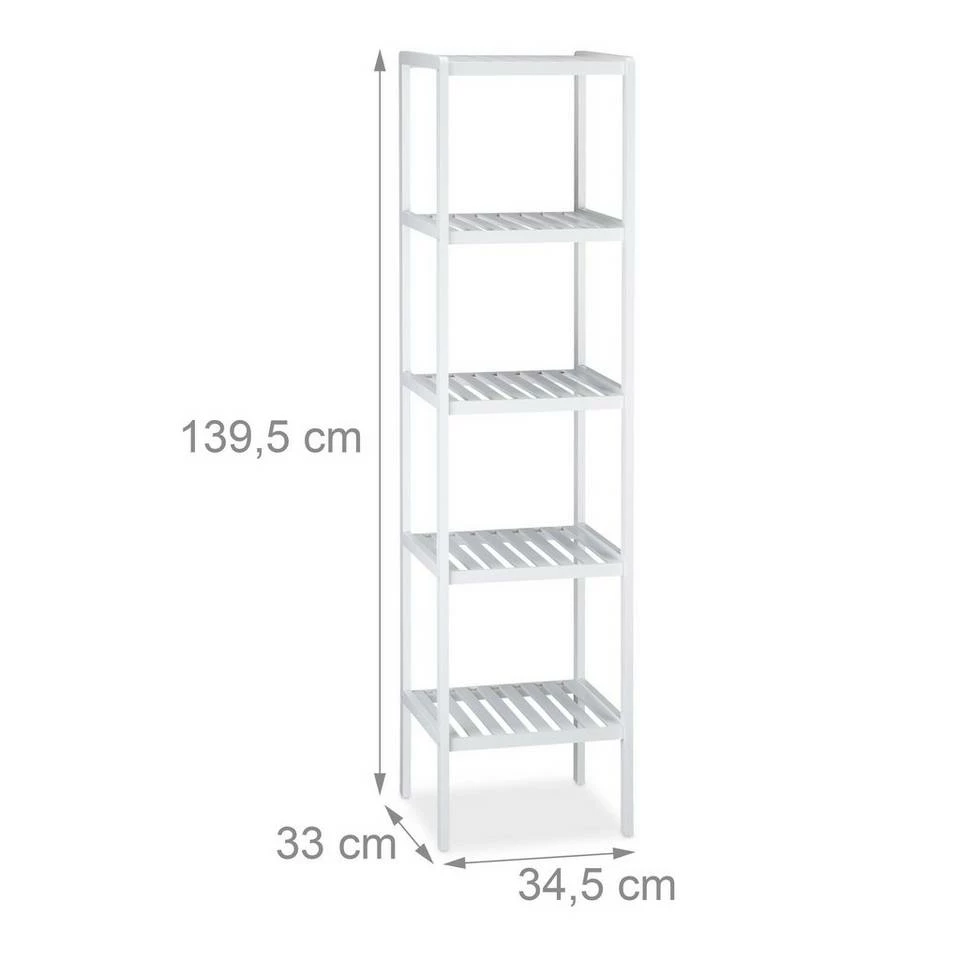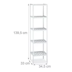 Bambus Badregal weiß Im Keller wird der Platz langsam knapp und auch im Wohnzimmer wissen Sie gar nicht mehr, wo Sie mit all den Büchern, Zeitschriften, Schuhen und den anderen Gegenständen hinsollen? Dieses Standregal sorgt dank seiner geringen Stellfläche im Handumdrehen für neuen Stauraum. Die 5 quadratischen Ablageflächen des Badregals stechen durch ihre luftige Gitter-Optik ins Auge. Das Küchenregal ist aus Bambus gefertigt und kommt in der weißen Farbvariante zu Ihnen. Nicht nur optisch überzeugt das Bambusregal, denn es ist darüber hinaus auch leicht zu montieren. Alles, was Sie dafür benötigen, ist im Lieferumfang bereits enthalten.