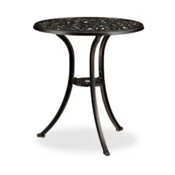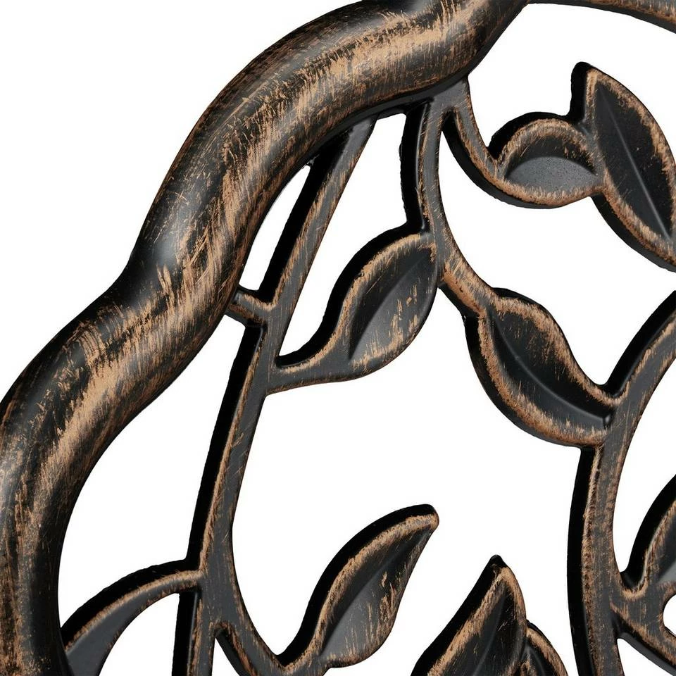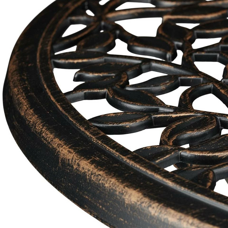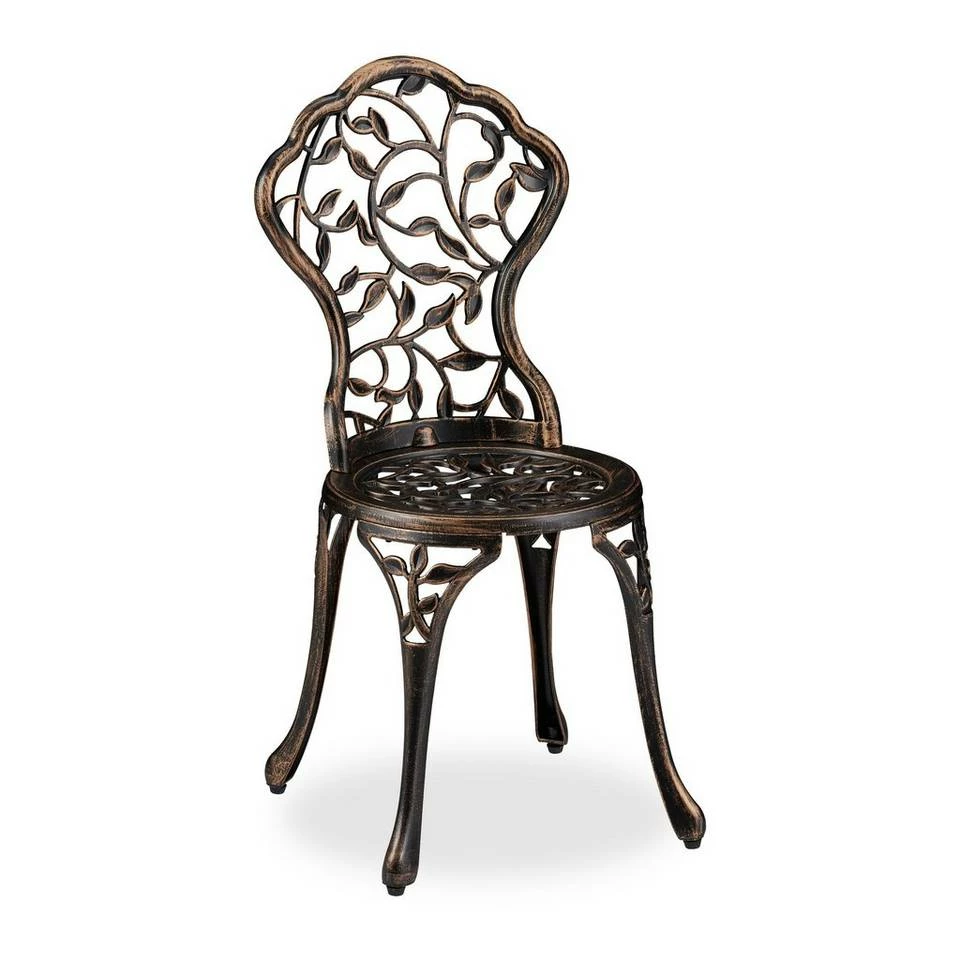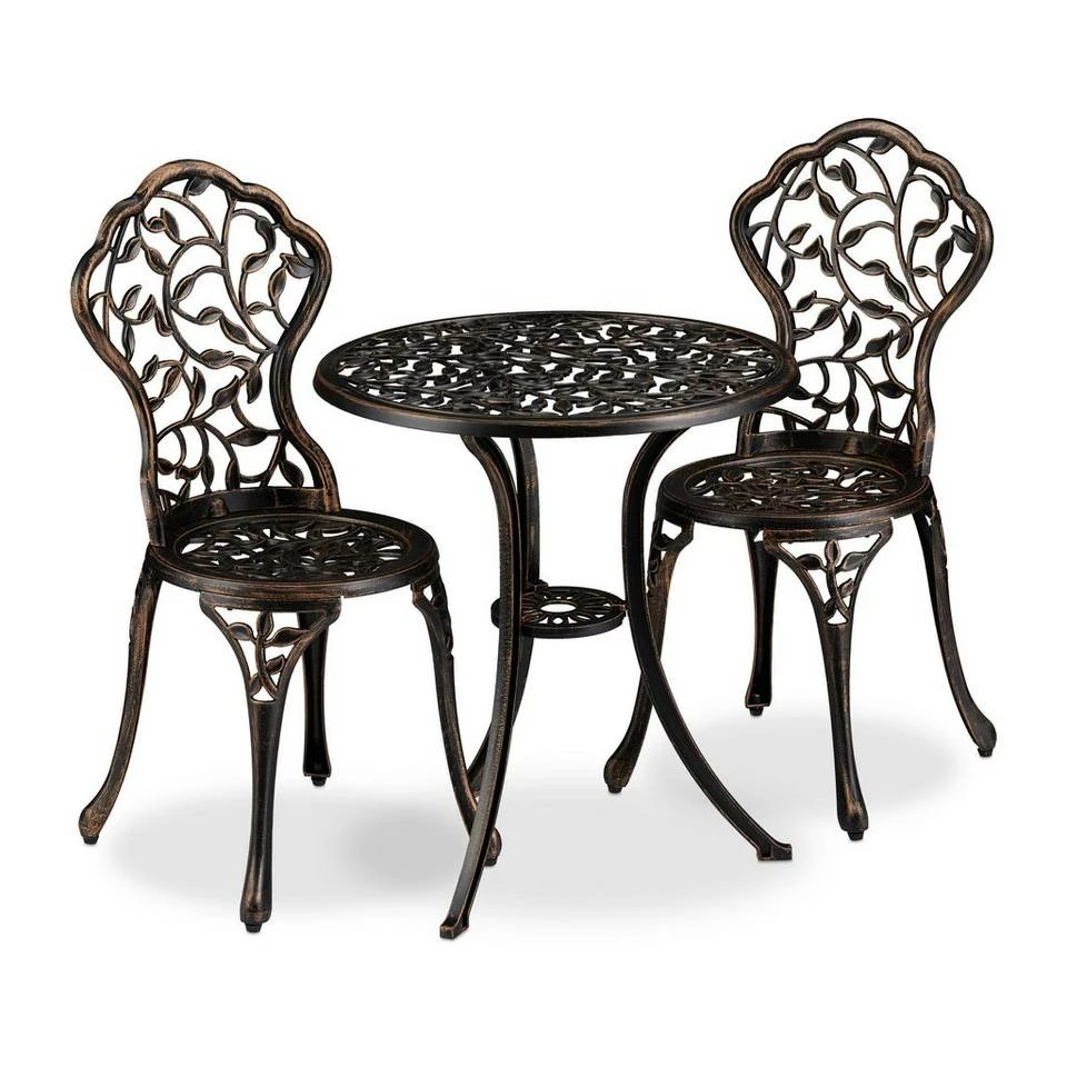Runder Gartentisch mit 2 Stühlen im Set Das Gartenmöbel Set für 2 Personen bringt französischen Esprit auf Balkon, Terrasse oder in den Garten. Das florale Muster auf Tisch und Stühle versprüht romantischen Charme. Das Brushed Design in Schwarz und Bronze verleiht dem Bistro Möbel Set ein nostalgisches Flair. Die Balkonmöbel aus Aluminium sind leicht und doch belastbar und wetterfest. Die kompakte Sitzgruppe ist ideal für den kleinen Balkon, überzeugt aber auch im Garten zwischen Blumen und Bäumen.
