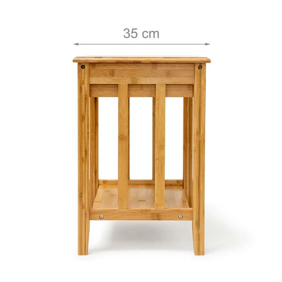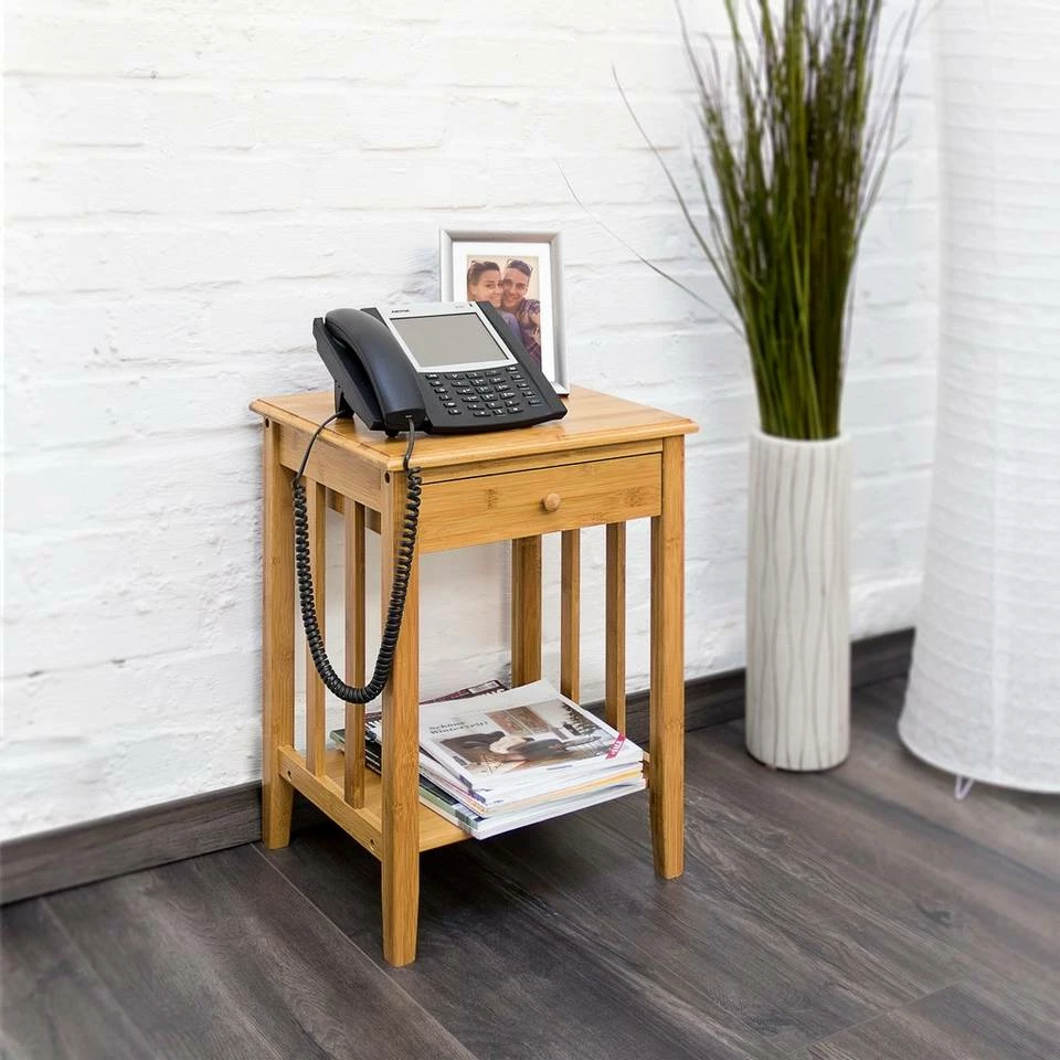 Stauraum für jedes Zimmer Dieser Beistelltisch schafft auch auf den kleinsten Flächen noch wertvollen Stauraum. Die natürliche Maserung des Bambus passt in fast jede Umgebung. Das feuchtigkeitsresistente Holz macht den Tisch auch zu einer idealen Ablagefläche für das Bad. Der beinahe quadratische Beistelltisch verfügt über 2 große Ablageflächen. Seitliche Verstrebungen verhindern, dass Gegenstände an den Seiten herunterfallen können. Eine Schublade bietet zusätzlich Platz für zahlreiche kleinere Gegenstände.