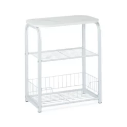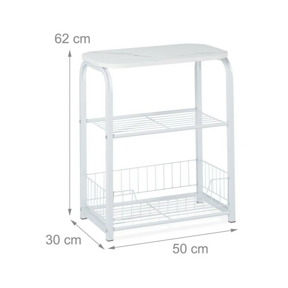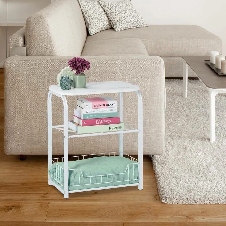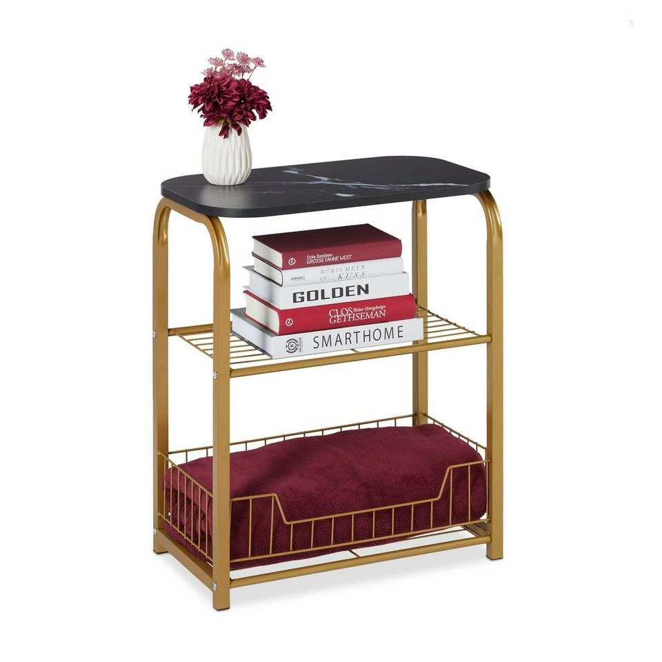 Ablagetisch in Marmor-Optik Dieser praktische Beistelltisch bietet die perfekte Ablagefläche neben Ihrem Sofa. Getränke, kleine Snacks, die Fernbedienung und alles andere, was Sie für einen gemütlichen Filmabend brauchen, können Sie auf der Tischplatte abstellen. Die 2 Ablagen bieten zusätzlich Platz für Decken und Magazine. Auch optisch überzeugt der Wohnzimmertisch mit seinem Mix aus eleganter Marmor-Optik und schlichtem Metall. Setzen Sie mit dem Korbtisch einen stilvollen Eyecatcher in Ihrem Wohnzimmer.