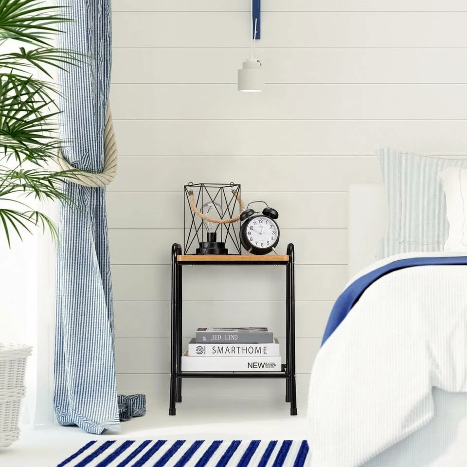 Vielseitiger Ablagetisch im Materialmix Der niedrige Beitisch ist die perfekte Ablage, um neben dem Sofa kleine Snacks, Getränke oder die Fernbedienung griffbereit zu haben. Auf der unteren Gitterablage können Sie Ihren liebsten Lesestoff ablegen. Aber auch im Schlafzimmer macht sich der Tisch bestens neben dem Bett, um die Leselampe und den Wecker immer in Reichweite zu haben. Zudem ist das universale Tischchen als Flurtisch ebenso praktisch wie als Blumenhocke. Der Mix aus schwarzem Metall und Holzoptik ist in jeder Wohnung ein Hingucker.