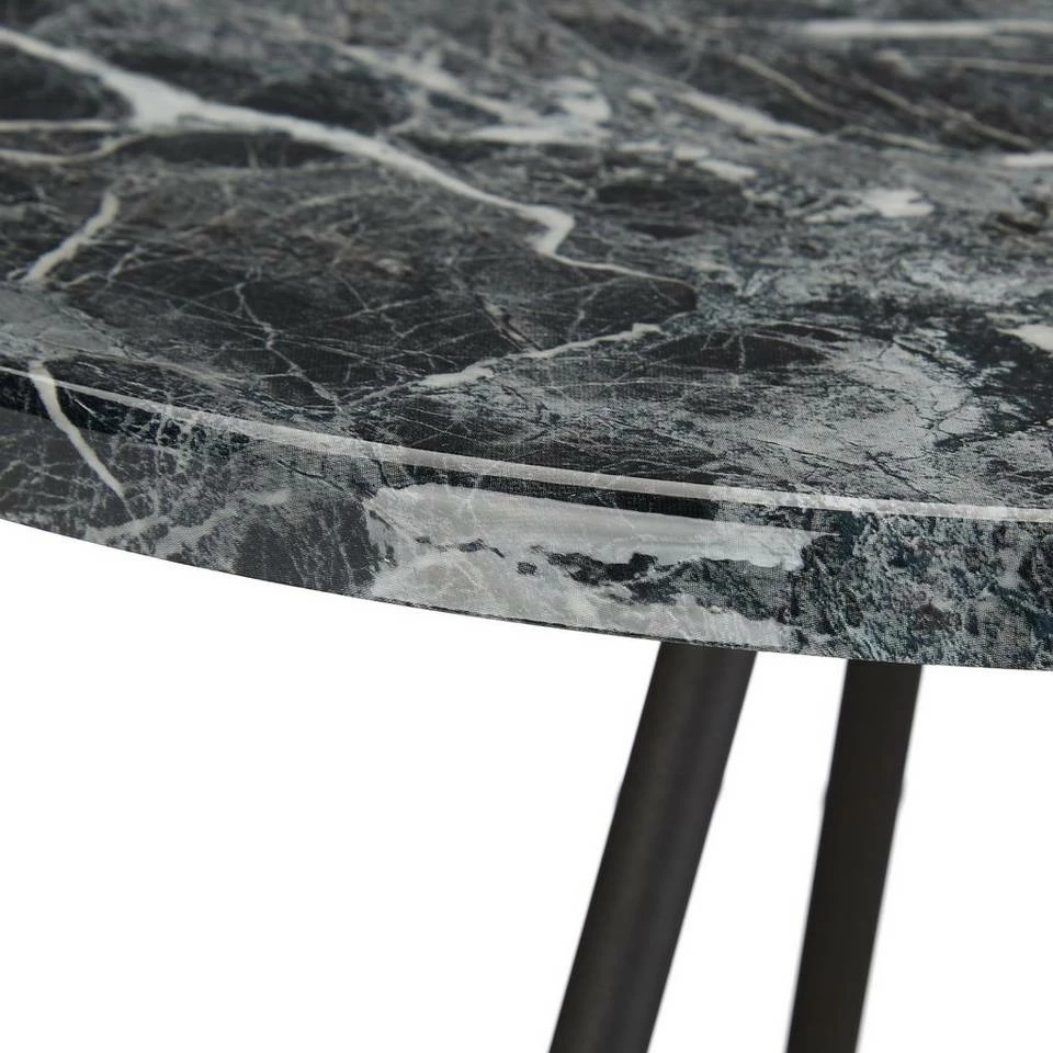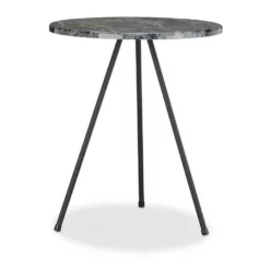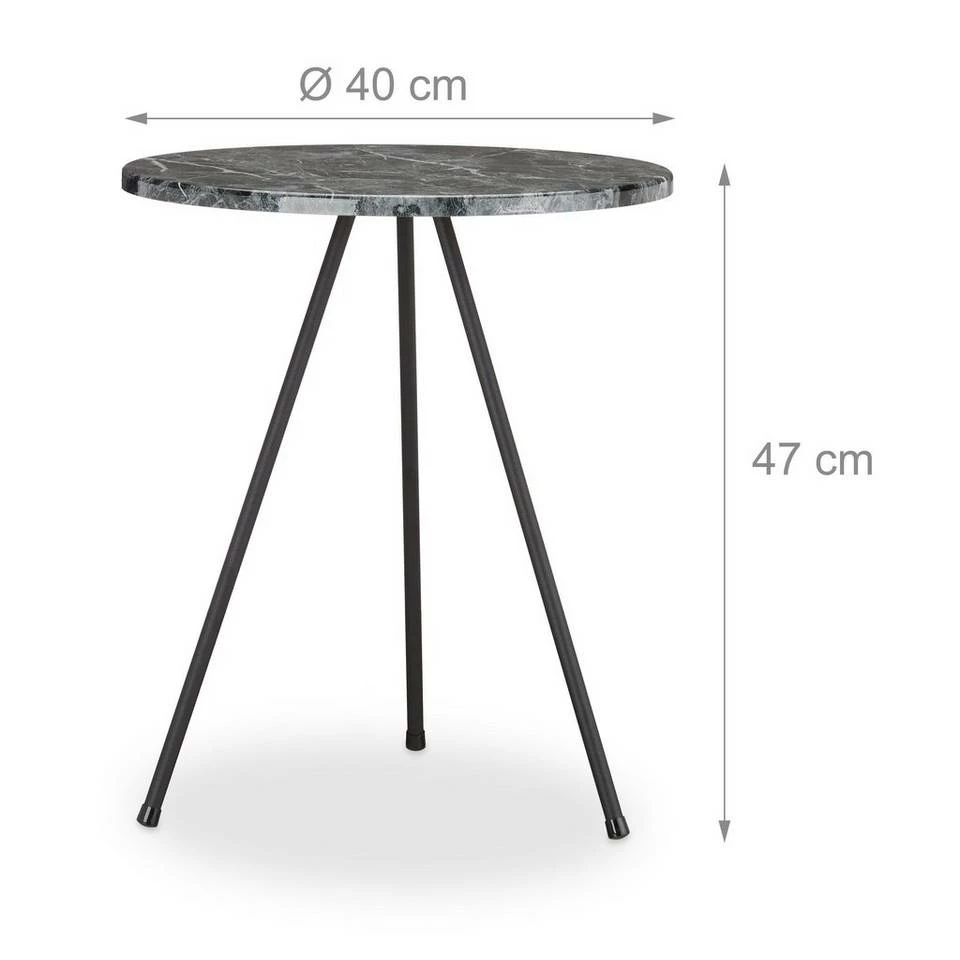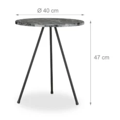 Runder Beistelltisch in Marmor Optik Verleihen Sie Ihrer Einrichtung das gewisse Etwas mit dem Beistelltisch in Marmor Optik. Das runde Tischchen ist mehr als nur eine Ablagemöglichkeit. Die Kombination aus marmorierter Tischplatte und schwarzen Metallbeinen im Gußeisen Look strahlen barocke Eleganz aus. Nutzen Sie den handlichen Marmortisch in allen Wohnbereichen. Bunte Zierpflanzen erhalten mit dem Designertisch eine attraktive Ablage. Im Wohnzimmer trägt der Abstelltisch Snacks und Getränke. Der Dreibeiner besteht aus einer lackierten MDF-Platte und einem Metallgestell. Gumminoppen für die Tischbeine schonen den Boden.
