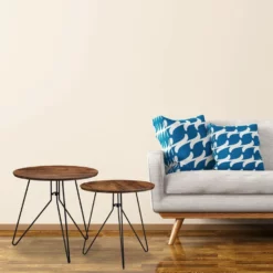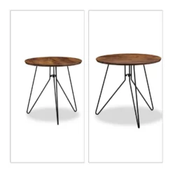 2er-Set Beistelltische in eleganter Holzoptik Dieses 2er-Tischset im Vintage-Look ist ideal, um in den eigenen vier Wänden neue Akzente zu setzen. Die Ablagetische überzeugen durch ihre edlen Tischplatten in dunkelbrauner Holzoptik, die dem Tischset gemütlichen Retro-Charme verleihen und es zu einem echten Hingucker in jeder Wohnung werden lassen. Die Rundtische eignen sich als Ablagetische, Couchtische oder Nachttische neben dem Bett. Aber auch Pflanzen oder Vasen werden auf dem Dekotisch perfekt in Szene gesetzt. Drei stabile Metallbeine sorgen dabei stets für einen sicheren Stand.