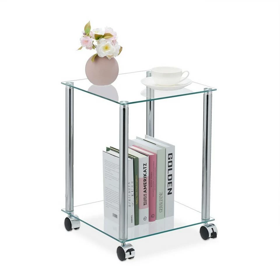 Rollbarer Sofatisch aus Glas Der viereckige Couchtisch ist die ideale Ablage für Snacks und Getränke beim abendlichen Entspannen auf dem Sofa. Auf den 2 Ebenen haben Sie Bücher und Zeitschriften immer in Reichweite oder können Blumen und Deko attraktiv arrangieren. Durch die Rollen ist der Nebentisch mobil und kann immer dahin geschoben werden, wo er gerade benötigt wird. Das zeitlose Design aus Glas und glänzendem Metall macht den Tisch in jedem Raum zum Hingucker.
