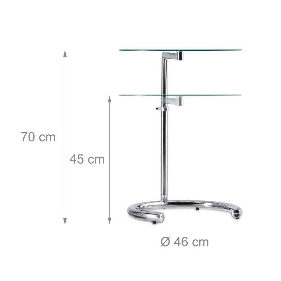 Schicker Kaffeetisch für Ihr Zuhause Der runde Beistelltisch bietet Ihnen viele Möglichkeiten. Er ist praktisch, wenn Sie im Innenbereich oder auf dem Balkon allein oder zu zweit Kaffee trinken möchten, überzeugt aber auch als Ablagemöglichkeit im Wohnzimmer oder als schicker Nachttisch. Snacks, Zeitschriften oder Fernbedienungen sind dank des Couchtischs jederzeit griffbereit. Sie müssen sich nicht dem Glastisch anpassen, denn er passt sich Ihnen an: Mit wenigen Handgriffen legen Sie die optimale Nutzungshöhe fest. Auch optisch punktet der Wohnzimmertisch dank seines zeitlosen Designs, das viele Einrichtungen bereichert.