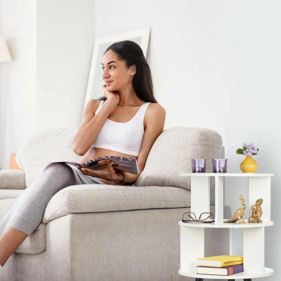 - Dekorativ: Aufbewahrungstisch mit runder Tischplatte – Versetzte Optik der 3 Ablagen als Blickfang