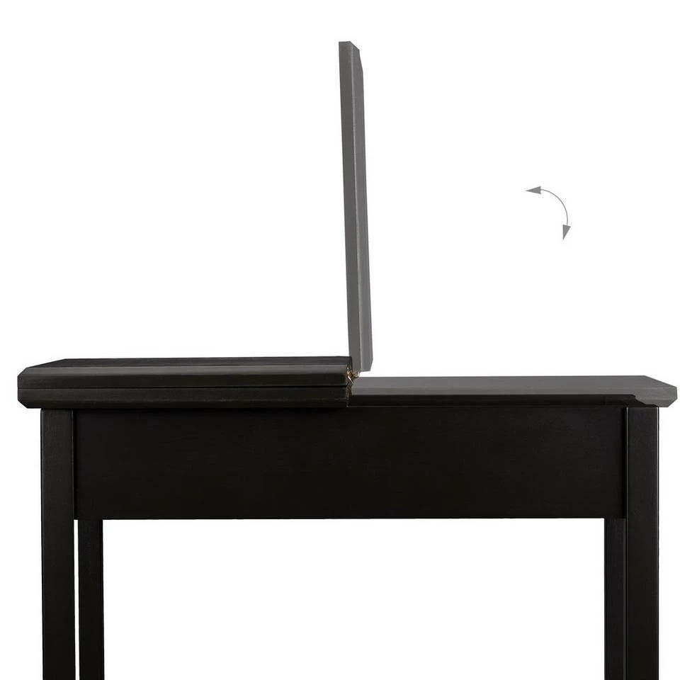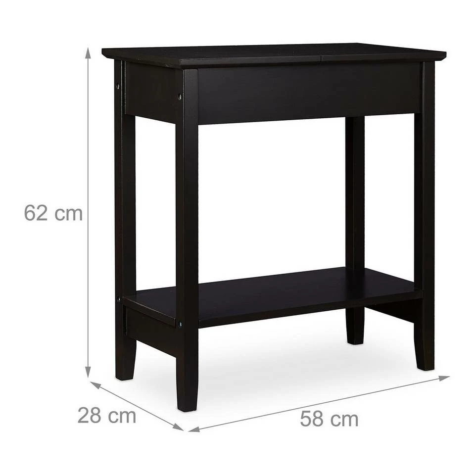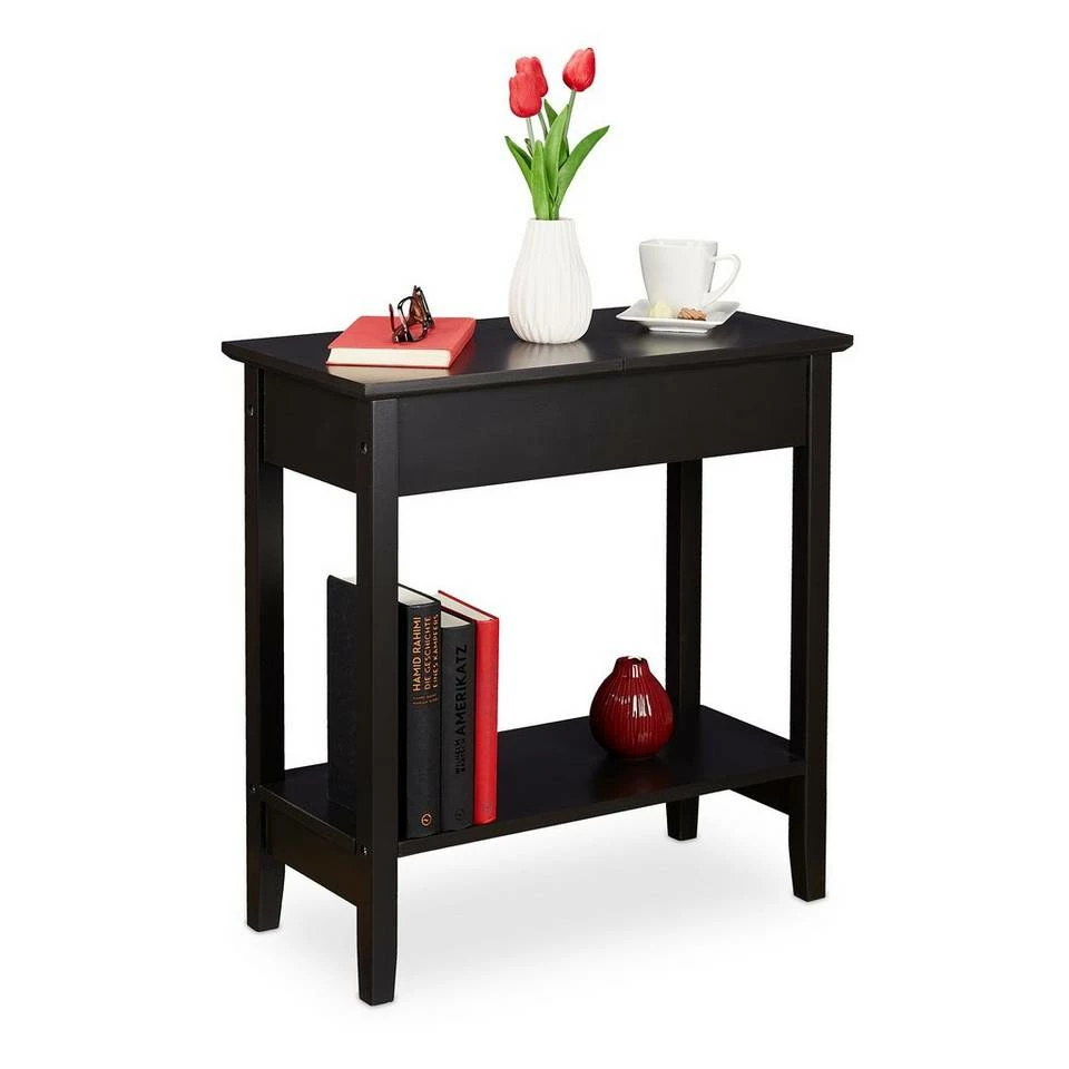 Schwarzer Couchtisch mit aufklappbarer Tischplatte Dieser Beistelltisch überzeugt mit seiner schlichten Optik, die sich in viele Einrichtungsstile gut einfügt, und seinem durchdachten Design. Das extra Fach, das sich unter der aufklappbaren Tischplatte verbirgt, und die zusätzliche, untere Ablage bieten viel Stauraum auf einer geringen Stellfläche. Sowohl als Ablagetisch neben der Couch im Wohnzimmer, als Nachttisch im Schlafzimmer oder als Telefontisch im Flur macht das Tischchen eine gute Figur.