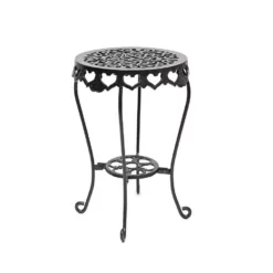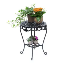 Blumenhocker aus Gusseisen Dieser Blumenhocker bietet auf 2 Ebenen viel Platz für Ihre Pflanzen. Der Blumenständer aus pulverbeschichtetem Gusseisen ist bis zu einem Gewicht von ca. 40 kg belastbar und eignet sich so optimal für Topfpflanzen oder als Ablage für andere Gartendekoration. Durch das relativ hohe Gewicht stehen die wetterbeständigen Blumenhocker auch bei Wind stabil auf Ihrer Terrasse oder in Ihrem Garten. Durch das verspielte Muster passt der Blumentisch ideal zum Landhaus-Stil und fügt sich auch als kleiner Beistelltisch gut in Ihr Wohnzimmer ein.
