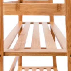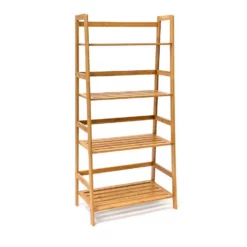 Holzregal mit 4 Etagen Verstauen Sie Ihre Lieblingsbücher, Filme oder CDs in diesem schicken Bücherregal. Auf den 4 Böden sorgen Querleisten dafür, dass nichts an den Seiten oder nach hinten durchrutschen kann. Dabei werden sie Abstellflächen nach oben hin schmaler, da das Regal im Profil eine stylische Treppenform aufweist. Damit fügt es sich modern und optisch ansprechend in Ihre Einrichtung. Der natürliche Bambus mit seiner feinen Maserung verstärkt hierbei den rustikalen Charakter des Möbelstücks. Durch das widerstandsfähige Material ist das Standregal auch gut für den Wintergarten oder das Bad geeignet.
