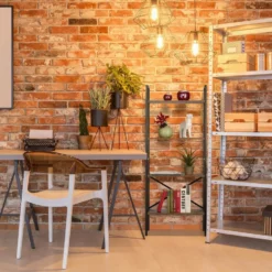 - Design: Büroregal mit schwarzem Metallgestell und Ablagen in brauner Holzoptik für rustikales Flair