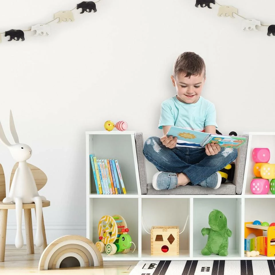 - Zum Sitzen: Spielzeugregal mit weich gepolsterten Kissen und Rückwand – Als Sitzgelegenheit nutzen