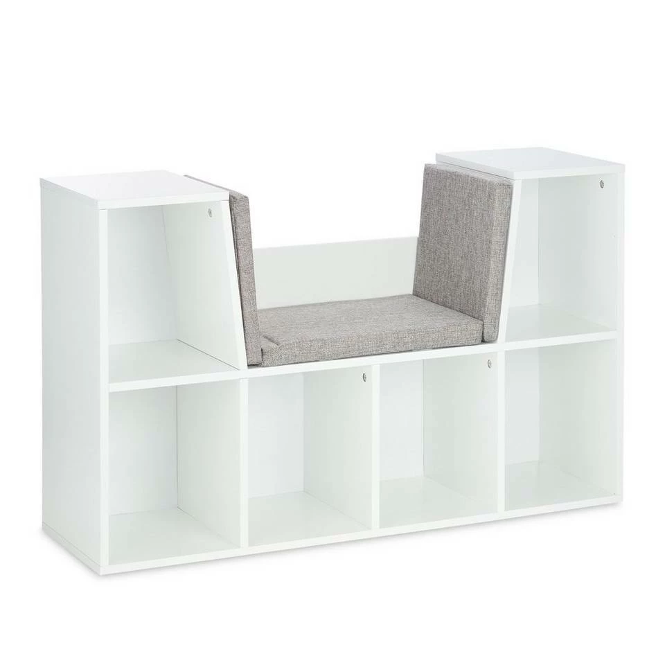 Modernes Kinderregal mit Sitzfläche Schaffen Sie wertvollen Stauraum im Spiel- oder Kinderzimmer mit diesem modernen Bücherregal. In 6 Fächern finden diverse Spielsachen, Bastelzubehör, Kuscheltiere, Puppen und vieles mehr ordentlich und übersichtlich Platz. Besonderes Highlight des Kinderregals ist die weich gepolsterte Sitzfläche mit abnehmbaren Kissen. Dort können es sich Ihre Kleinen beim Lesen gemütlich machen oder sich nach dem Spielen ausruhen. Das neutrale Design des Spielregals eignet sich dabei für Jungen und Mädchen.