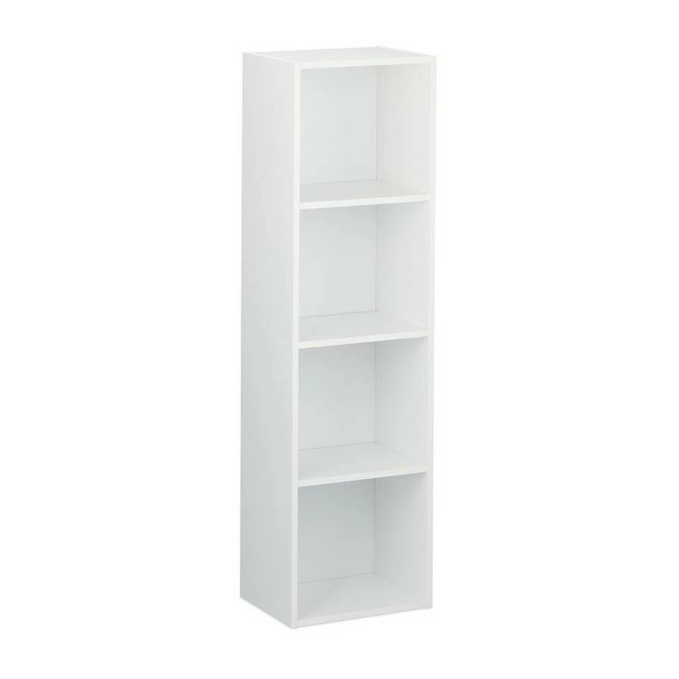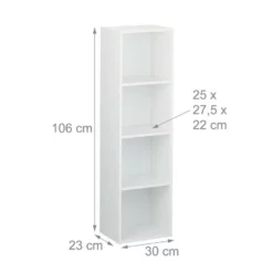 Schlichtes Standregal mit 4 Fächern Wenn Sie moderne Möbel mit klaren Linien mögen, ist dieses Bücherregal genau das Richtige für Sie. Das Standregal in Weiß bietet Ihnen mit seinen 4 Fächern jede Menge Stauraum, ohne sich dabei optisch in den Vordergrund zu spielen. Auch Vasen, Figuren oder Fotos finden in dem Mehrzweckregal einen Platz. Um es abzusichern, lässt sich das Wohnregal zusätzlich an der Wand befestigen. Dank der Schoner aus Moosgummi haben Kratzer im Boden keine Chance.
