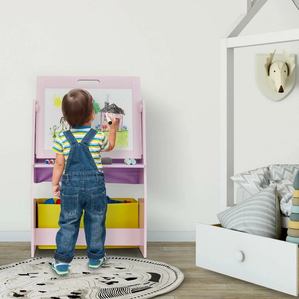 3 in 1 Kinderzimmerregal mit Maltafel Dieses vielseitige Spielregal ist ein tolles Möbelstück für jedes Kinderzimmer. Das 3 in 1 Kinderregal bietet auf der einen Seite Stauraum in einer Aufbewahrungsbox und 2 Stofffächern, die dabei helfen, Ordnung in die Spielecke zu bringen. Auf der anderen Seite hat Dein Kind mit der zweiseitigen, verstellbaren Tafel mit Tisch eine tolle Beschäftigungsmöglichkeit zum Malen, Basteln und Schreiben. Dank der kindgerechten Höhe ist das bunte Spielregal für Kinder ab 3 Jahren perfekt geeignet.