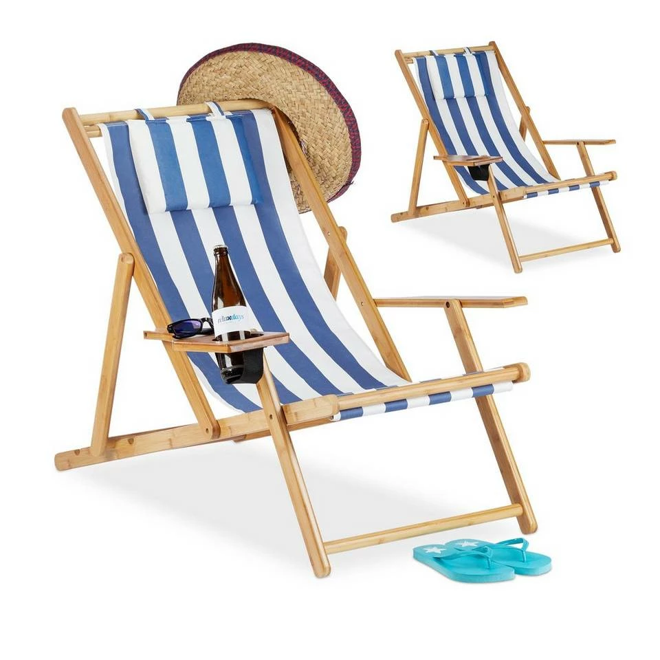 Gestreifter Klappliegestuhl für optimales Urlaubsfeeling Sie wollen den Alltagsstress hinter sich lassen und gemütlich entspannen? Mit diesen Strandliegestühlen im Streifen-Design ist das kein Problem. Genießen Sie den Komfort mit dem Nackenkissen und der praktischen Getränkehalterung. Richtig gemütlich wird es, wenn Sie Ihre ideale Liegeposition eingestellt haben. Dabei können Sie aus 4 verschiedenen Höhen wählen. Die Liegestühle für In- und Outdoor kommen im Doppelpack, weshalb Sie das Gefühl von Strand und Meer miteinander teilen können.
