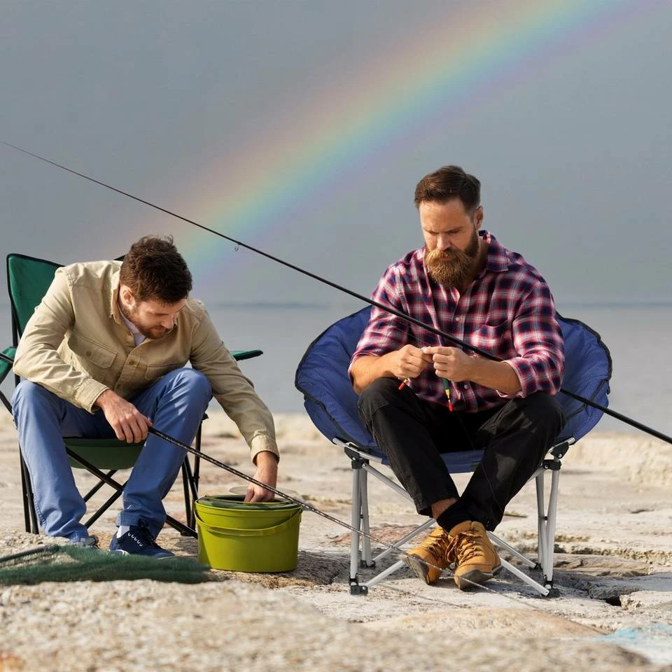Faltbarer Campingstuhl zum Relaxen im Freien Dieser Campingsessel ist ideal für alle Fans von Outdoor-Ausflügen, die nicht auf Komfort verzichten wollen. Die gepolsterte XXL Sitzfläche & große Rückenlehne laden zum ausgiebigen Relaxen ein. Ob im Garten, auf Balkon oder Terrasse, mit dem Mondstuhl lässt sich die warme Sonne wunderbar genießen. Er ist im Handumdrehen zusammengefaltet & in der Tragetasche zum Transport verstaut. Somit kann der blaue Klappstuhl auch am Lagerfeuer beim Camping, auf Angelausflügen oder beim Festival überzeugen.