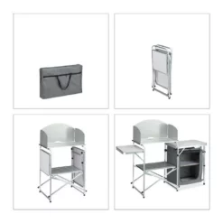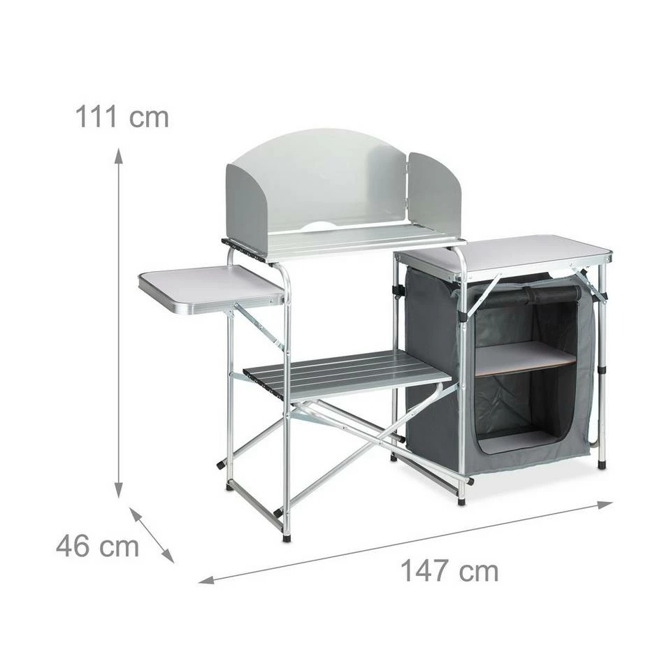 Große Outdoorküche für Camping Wer Campen liebt und nicht auf den nötigen Komfort verzichten will, für den ist diese Zeltküche ideal. Auf den 2 seitlichen Arbeitsplatten können Speisen bequem zubereitet werden. Die mittlere Ablage aus hitzebeständigem Aluminium ist für einen Gaskocher geeignet. Lebensmittel lassen sich, dank Fliegengitter geschützt vor Insekten, im geräumigen Stoffschrank lagern. Wenn der wohlverdiente Campingurlaub vorbei ist, wird die Küchenbox zusammengeklappt und platzsparend in der Tasche verstaut.