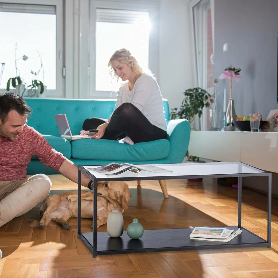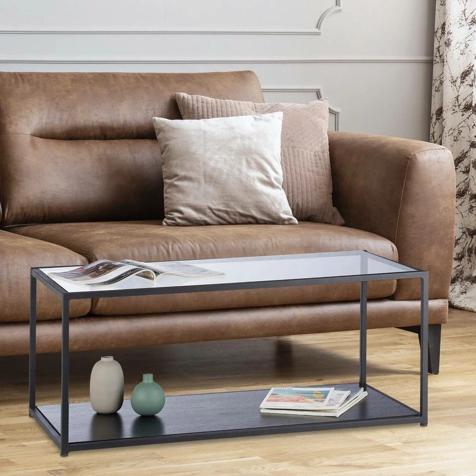 Rechteckiger Glastisch fürs Wohnzimmer Praktisch, modern und stabil präsentiert sich der Wohnzimmertisch mit solider Tischplatte aus gehärtetem Glas. Der Kaffeetisch verfügt über eine breite Ablage in Bodennähe und bietet somit genügend Abstellfläche vor dem Sofa. Ein schwarzer Rahmen aus Metall verleiht dem Sofatisch eine hohe Stabilität und fügt sich optisch gut in das Design des Glas-Couchtisches ein. Für einen ordentlichen Schutz von Laminat- oder Parkettböden sorgen kleine Bodenschoner an der Unterseite des Metallgestells.