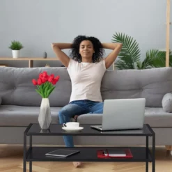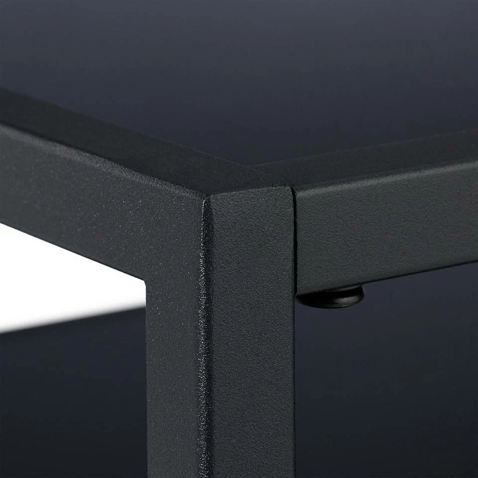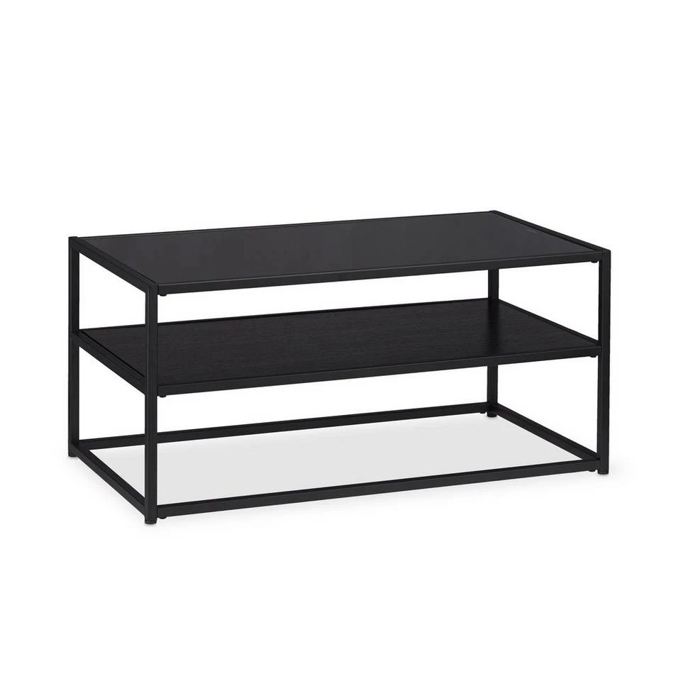 Schicker Couchtisch mit Glasplatte Einem entspannten Filmabend steht mit dem schönen Couchtisch aus Glas und Metall nichts mehr im Weg. Die Getränke stehen in angenehmer Höhe griffbereit. Eine Auswahl von Snacks und Filmen sind auf der großen Glasplatte verstreut. Der robuste Metallrahmen wird von Tischbeinschonern getragen. Die obere Glasplatte ist wie die restlichen Materialien dunkel gehalten und verleiht dem flachen Wohnzimmertisch einen eleganten Touch. Der schwarze Sofatisch mit 2 Ebenen ist gemacht für gemütliche Abende auf der Couch.