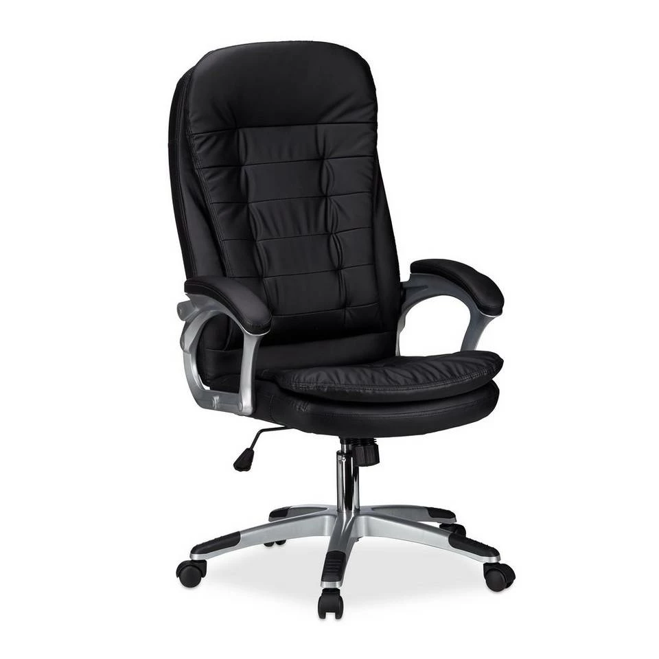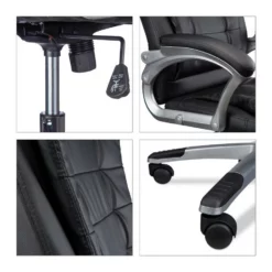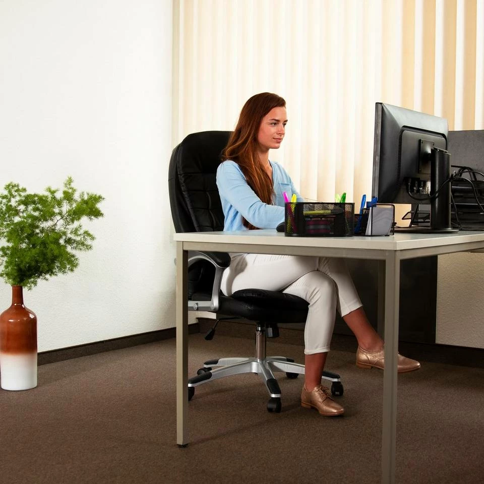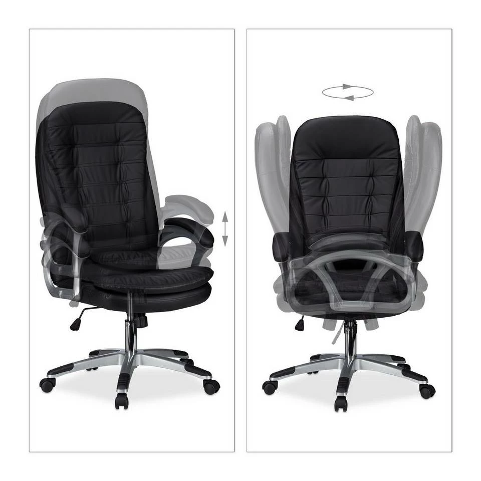 Rückenschonender Drehstuhl in Schwarz Mit dem orthopädischen Bürostuhl aus Kunstleder gehen Sie Rückenschmerzen am Büroschreibtisch aus dem Weg. Der höhenverstellbare Schreibtischstuhl verhindert dank Wippfunktion der Rückenlehne ein starres Sitzen und beugt auf diese Weise muskulären Verspannungen vor. Darüber hinaus verleiht der Chefsessel Ihrer Wirbelsäule durch eine Lordosenstütze zusätzliche Stabilität. Aber der Drehsessel ist nicht nur rückenfreundlich, sondern auch äußerst bequem. Holen Sie sich den modernen Bürosessel mit Armlehnenpolster an Ihren Arbeitsplatz.