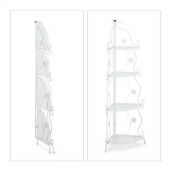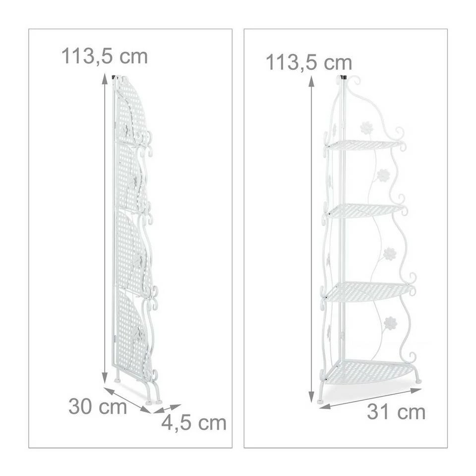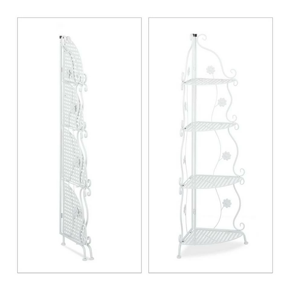 Dekoratives Eckregal mit Metallgestell Das Pflanzenregal schafft endlich den nötigen Platz, um geliebte Blumen dekorativ zu präsentieren. Bunte Blüten, Kräuter, Blumentöpfe, Deko und Vasen lassen sich auf den 4 Ablagen optisch schön anrichten. Gestalte Deine persönliche kleine Pflanzenecke im Wohnzimmer oder Wintergarten oder stelle das Eckregal geschützt im Garten, auf dem Balkon und der Terrasse auf. Dank ansprechendem Vintage Design mit dekorativen Blumenranken, wirkt das vielseitig einsetzbare Metallregal in jedem Raum.