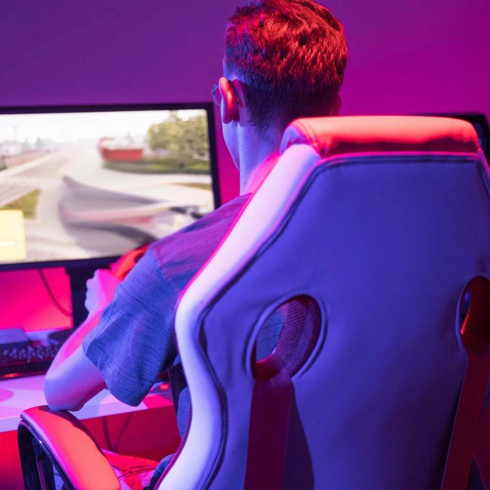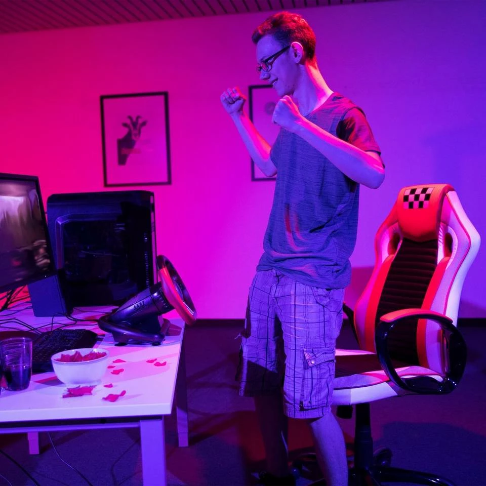 Gaming Stuhl Speed Racing für Freude am Zocken Lehnen Sie sich zurück und tauchen Sie ein in die Welt der Computerspiele. Mit dem Gaming Chair Speed Racing können Sie ganz bequem mehrstündige Zock-Sessions starten, ohne sich dabei den Rücken zu verspannen. Der gemütliche Drehstuhl passt sich dank Wippfunktion und verstellbarer Sitzhöhe perfekt an Ihren Körper an und bietet der Wirbelsäule dank geschwungener Rückenlehne optimalen Halt. Mit dem sportlichen Racing-Design eignet sich der Computerstuhl bestens für Liebhaber von Rennspielen. Durch die abriebfesten Laufrollen am Bürostuhl sind Sie auch selbst stets mit Topspeed unterwegs.