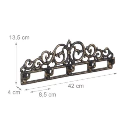 Garderobenleiste im barocken Vintage-Stil Diese Wandgarderobe bietet auf 5 Haken ausreichend Platz für all Ihre Jacken und restliche Garderobe. Die Haken sind aus stabilem Gusseisen gefertigt und halten auch Schirme uvm. Oder Sie verwenden die Flurgarderobe als elegante Schlüsselleiste. In jedem Fall bringt die Hakenleiste mit ihren barocken Ornamenten nostalgisches Flair in Ihr Zuhause.