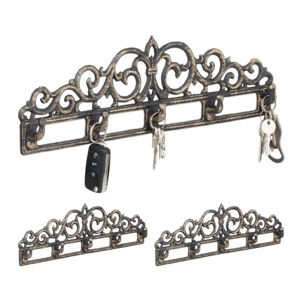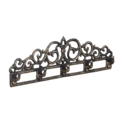 Garderobenleiste im barocken Vintage-Stil Diese Wandgarderobe bietet auf 5 Haken ausreichend Platz für all Ihre Jacken und restliche Garderobe. Die Haken sind aus stabilem Gusseisen gefertigt und halten auch Schirme uvm. Oder Sie verwenden die Flurgarderobe als elegante Schlüsselleiste. In jedem Fall bringt die Hakenleiste mit ihren barocken Ornamenten nostalgisches Flair in Ihr Zuhause.
