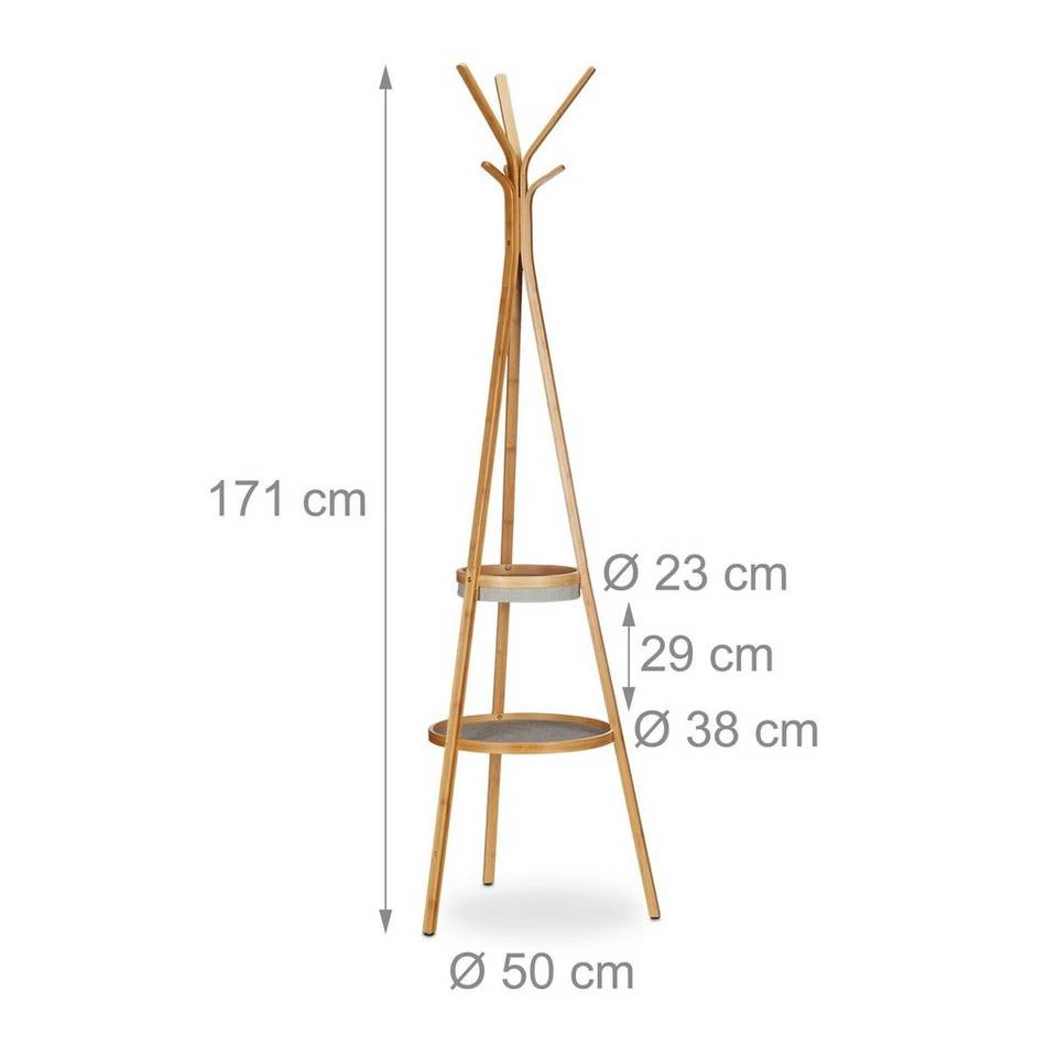 Hohe Garderobe mit runden Ablagen Der elegante Garderobenständer nimmt Ihnen Jacke, Mantel und Hausschlüssel ab, wenn Sie heimkommen. Der freistehende Kleiderständer mit zwei runden Ablagen in der Mitte ist aus Bambus. Er versprüht einen natürlichen Charme und fügt sich problemlos in jeden Flur. Die geschwungenen Arme bieten je zwei Haken für Winter- wie Sommerjacken. Die kleine Ablage bietet mit 3 Fächern Platz für Accessoires, Autoschlüssel und mehr. Die große Ablage eignet sich als praktische Briefablage oder dekorativer Blumenplatz. Nutzen Sie den leichten und doch robusten Kleiderbutler auch im Schlafzimmer als Herrendiener oder im Bad als Handtuchhalter.